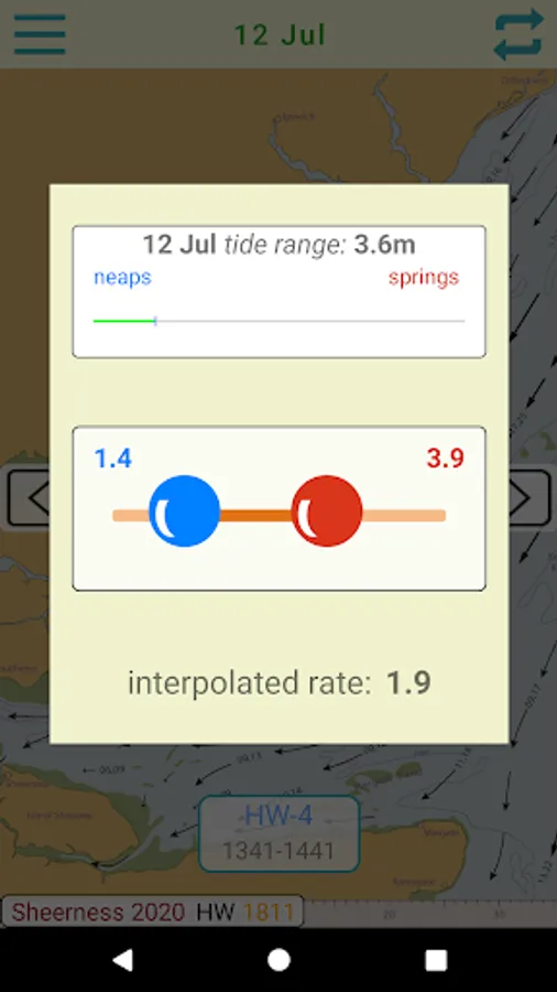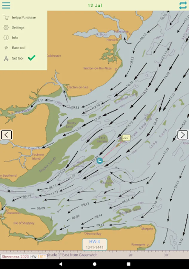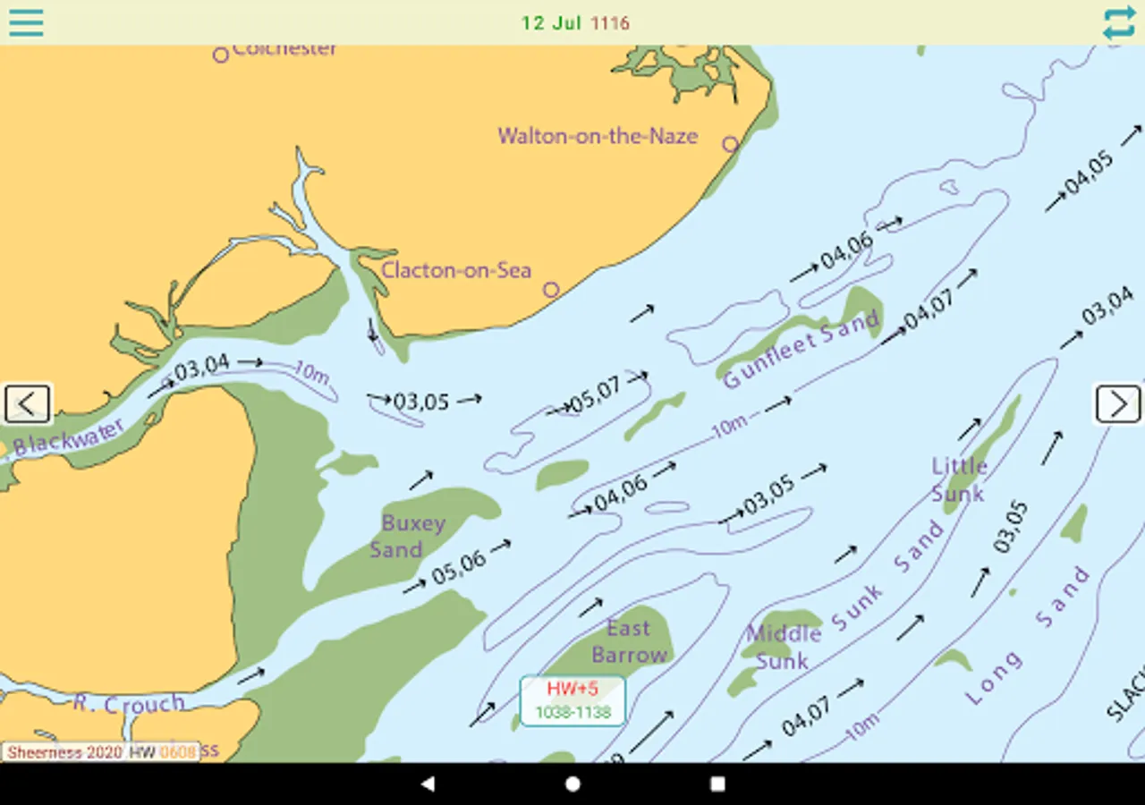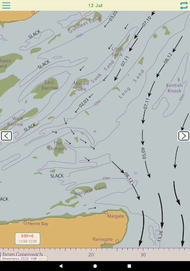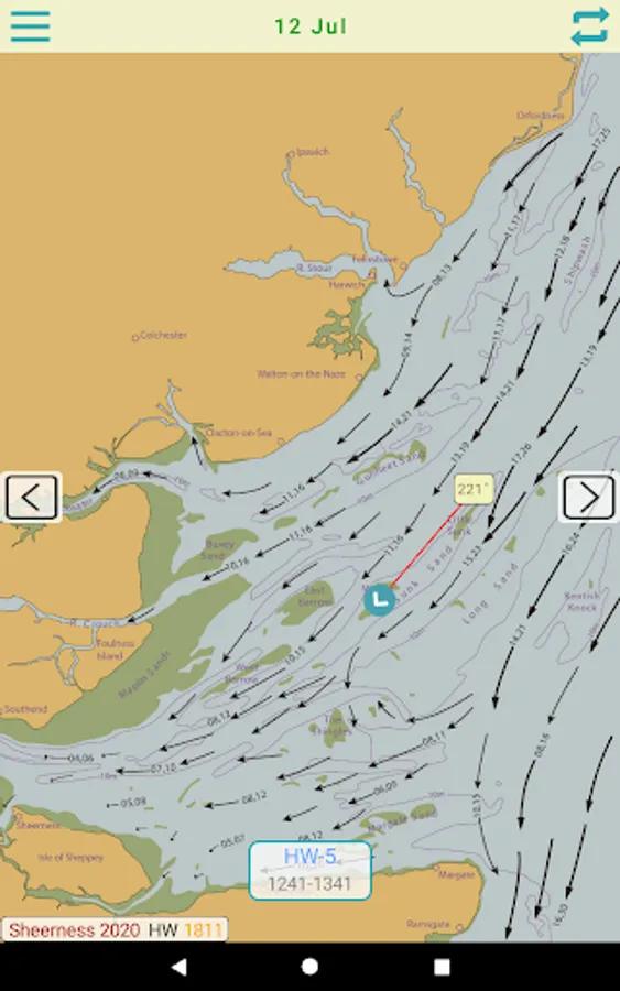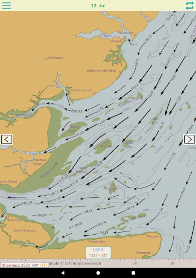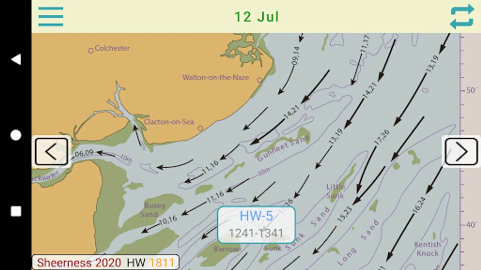 The app automatically selects the nearest Sheerness HW time of the day, but if you want to see data for the next or previous HW of the day, swipe forward or back to advance the tidal hour.