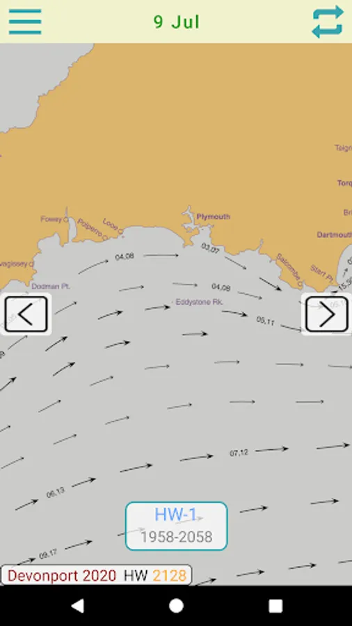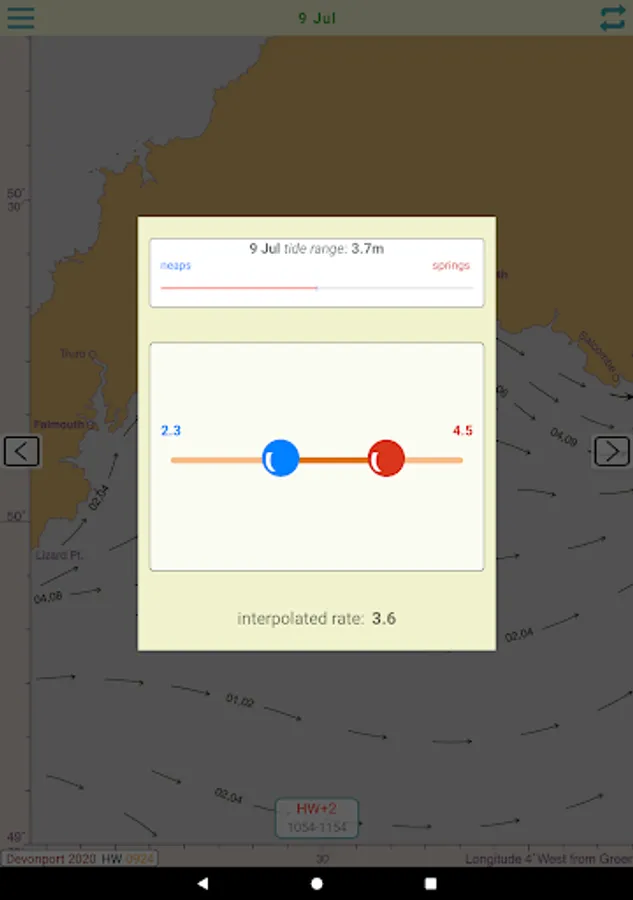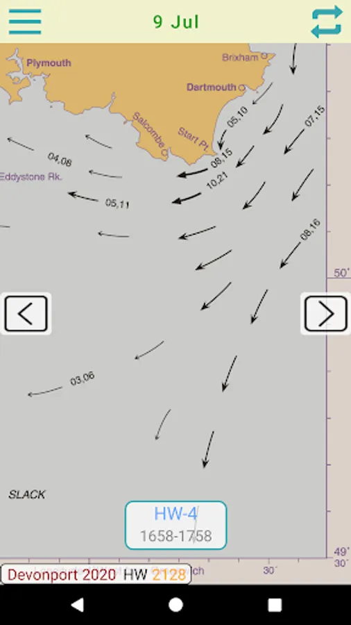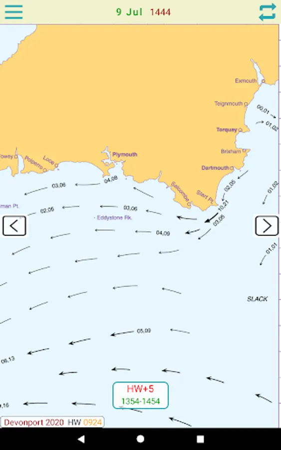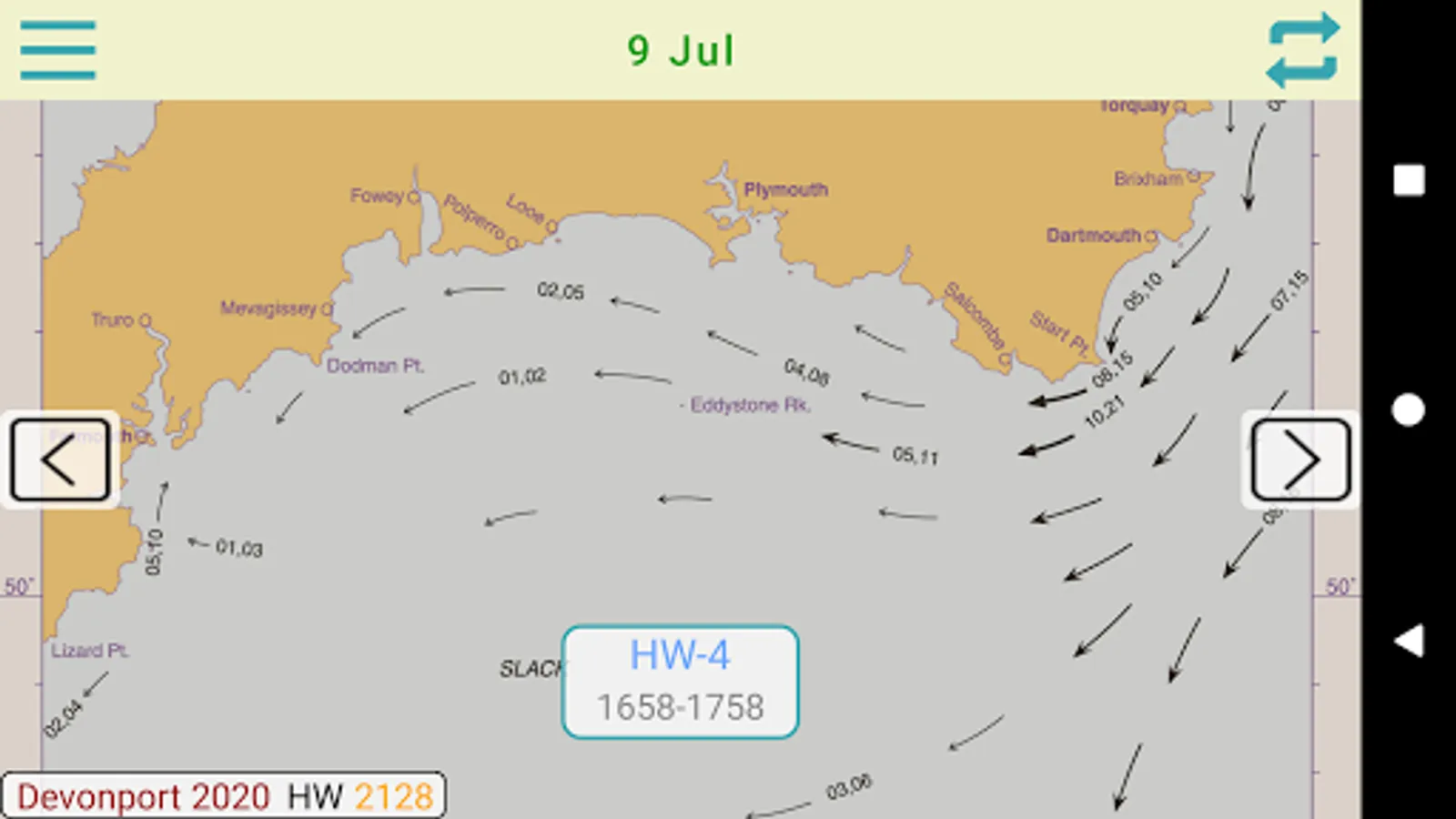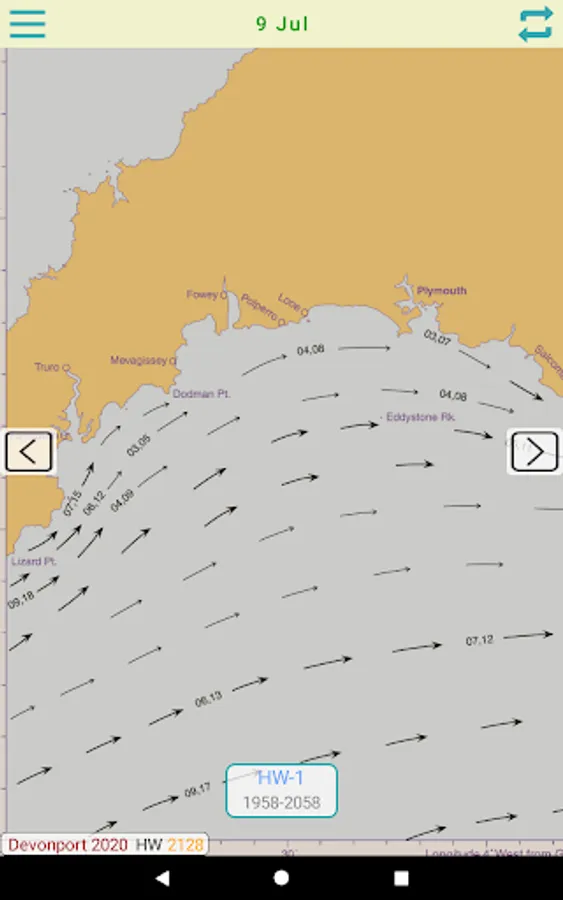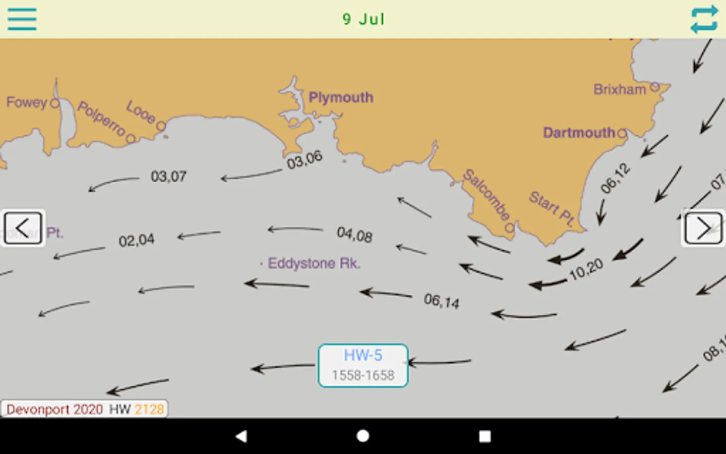 The app automatically selects the nearest Devonport HW time of the day, but if you want to see data for the next or previous HW of the day, swipe forward or back to advance the tidal hour.