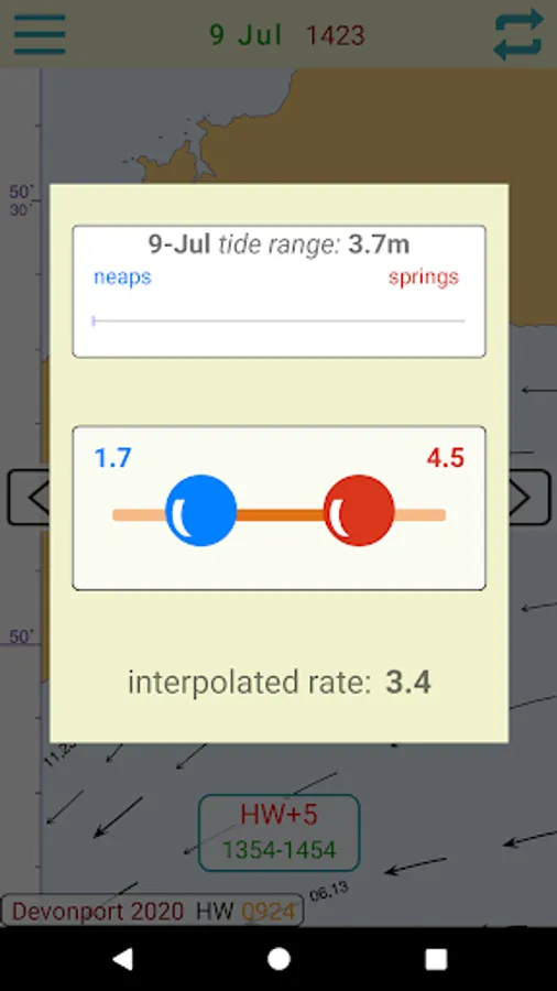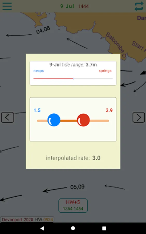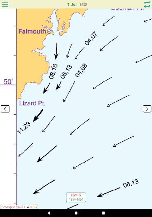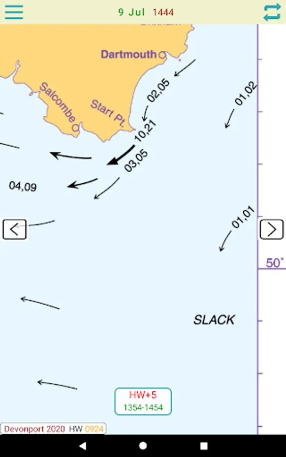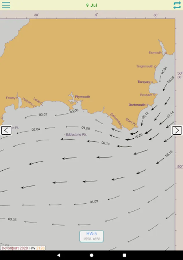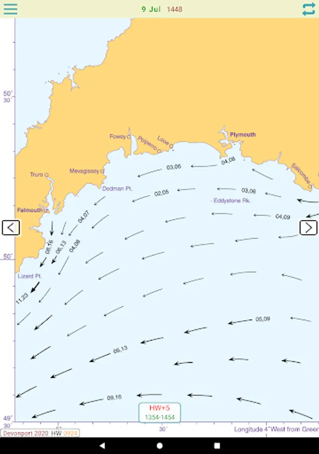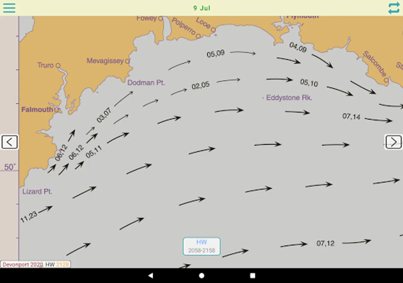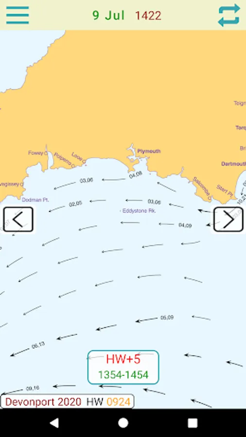 The app automatically selects the nearest Devonport HW time of the day, but if you want to see data for the next or previous HW of the day, swipe forward or back to advance the tidal hour.