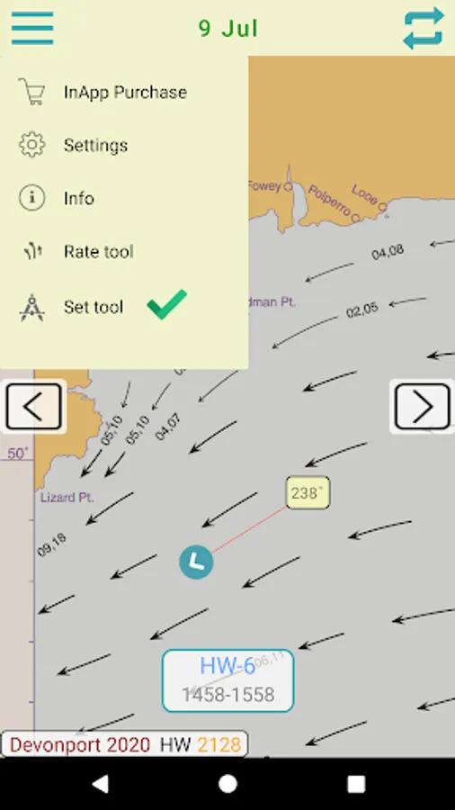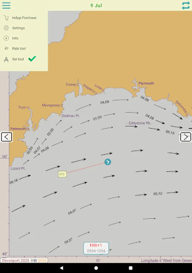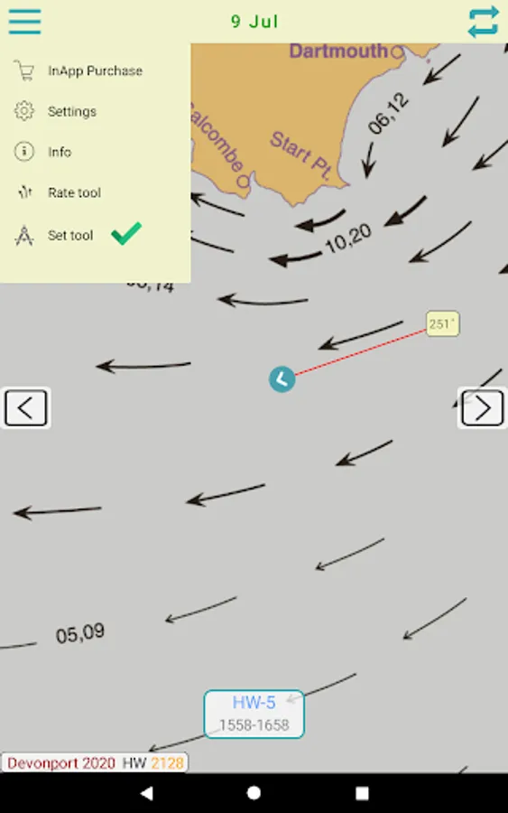 Select the 'Set' tool to measure the precise true course of any tidal stream arrow. (in-app purchase)