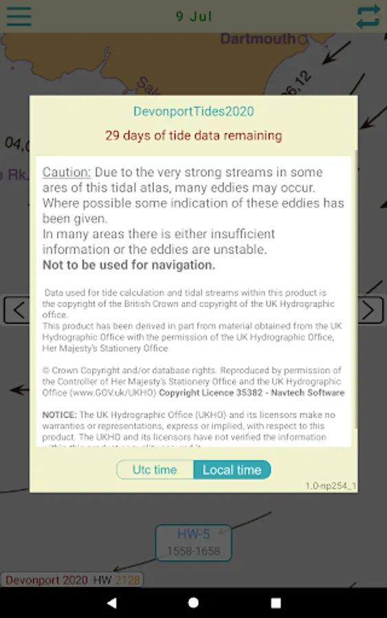 The nearest Devonport HW time to the actual time is selected from the database and the relevant streams chart is displayed, together with the time period for which the chart is valid.