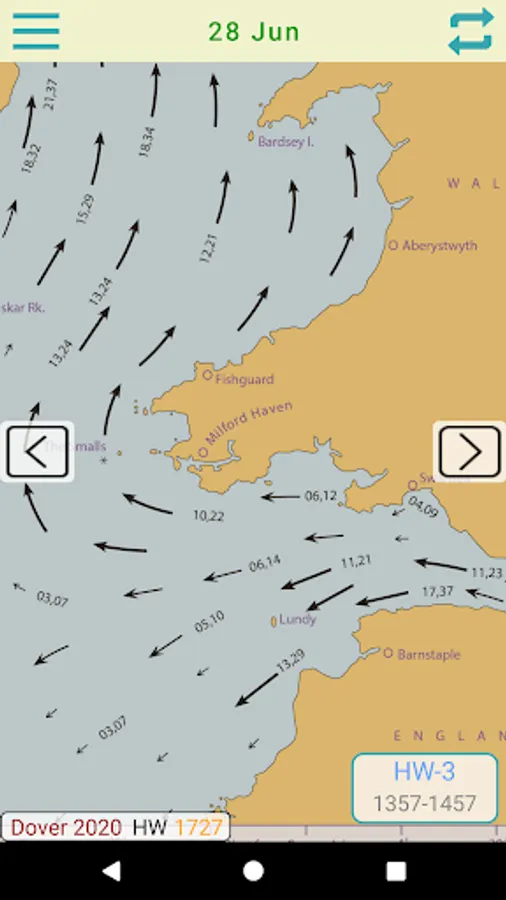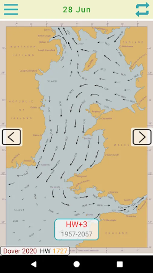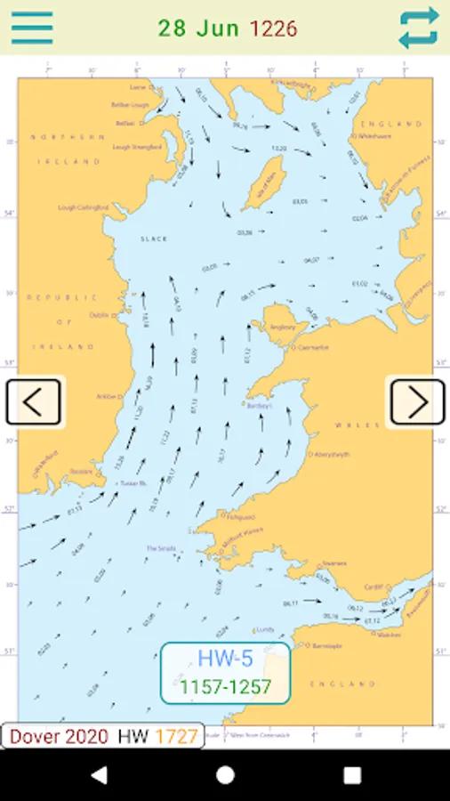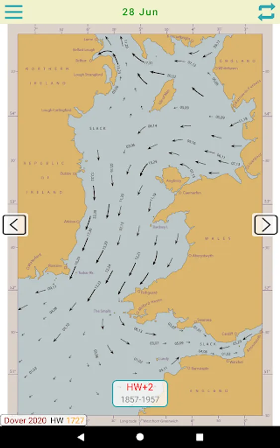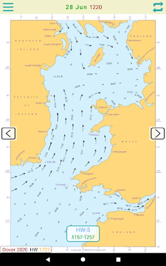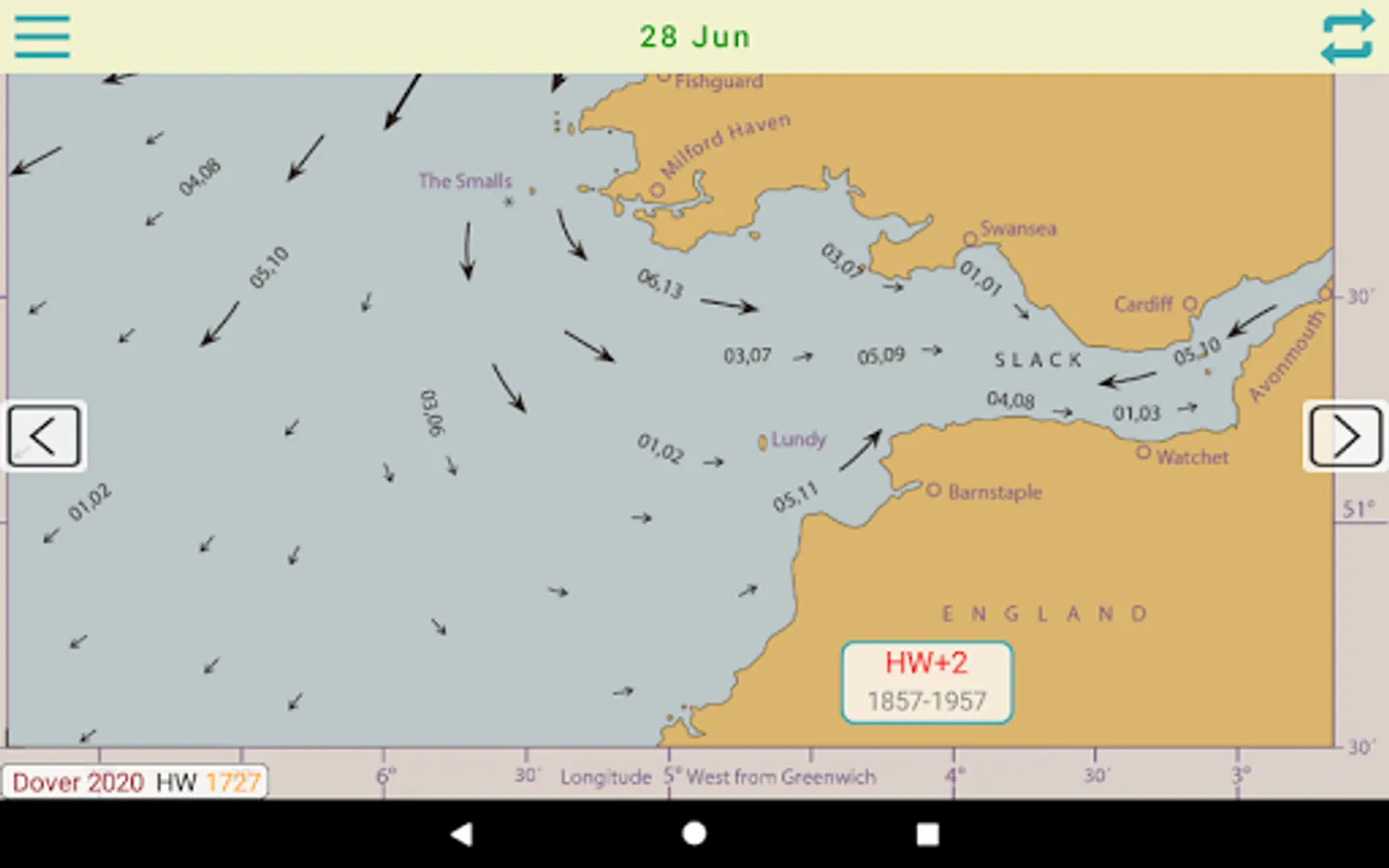The app automatically selects the nearest Dover HW time of the day, but if you want to see data for the next or previous HW of the day, swipe forward or back to advance the tidal hour.