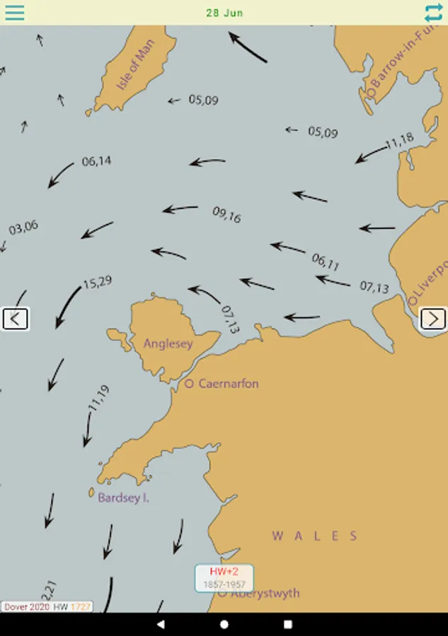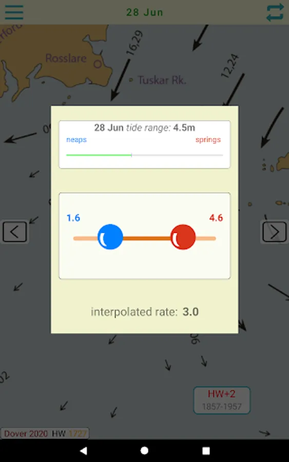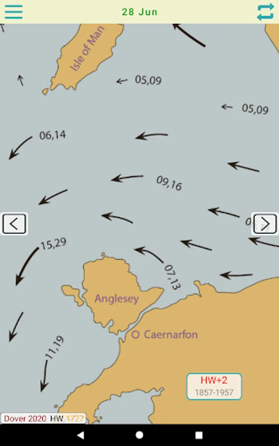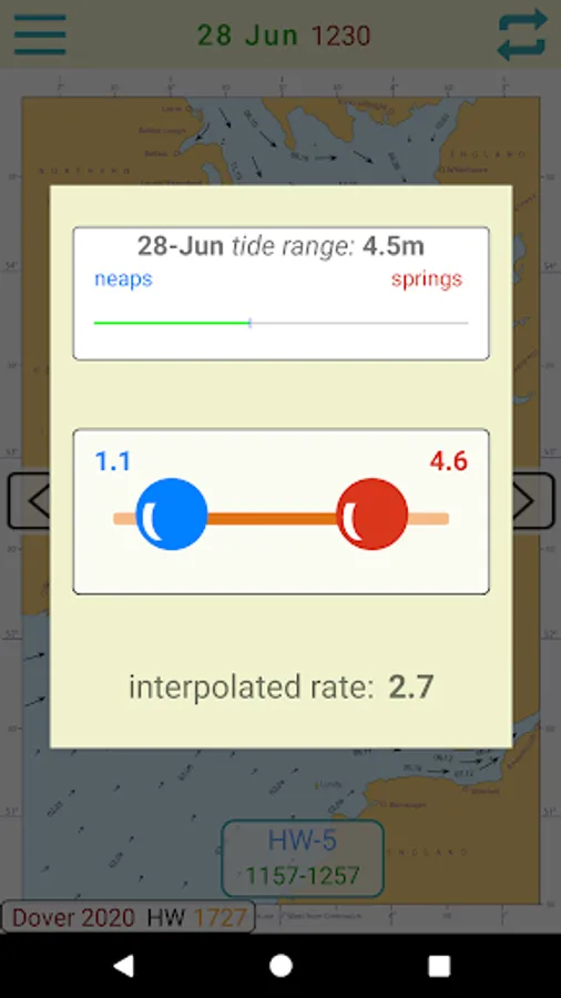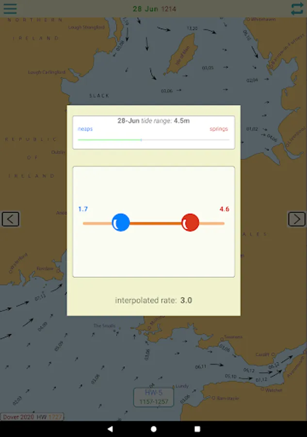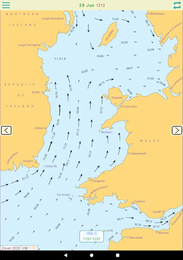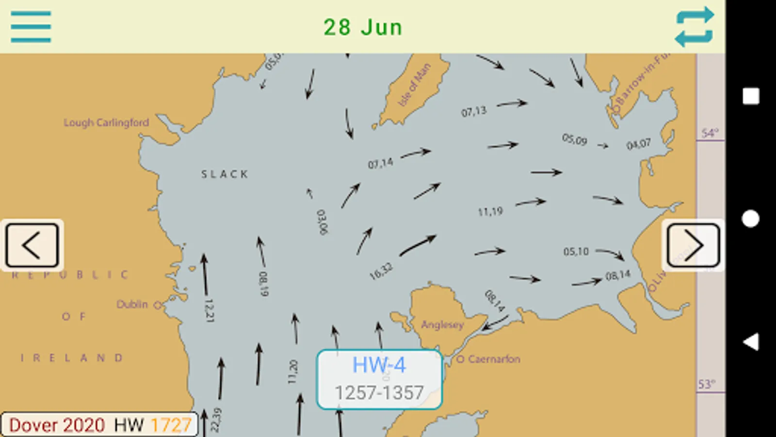 The app automatically selects the nearest Dover HW time of the day, but if you want to see data for the next or previous HW of the day, swipe forward or back to advance the tidal hour.