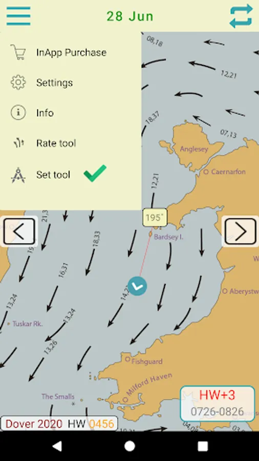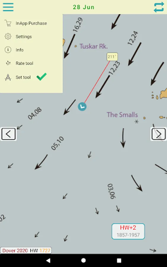 Select the 'Set' tool to measure the precise true course of any tidal stream arrow. (in-app purchase)