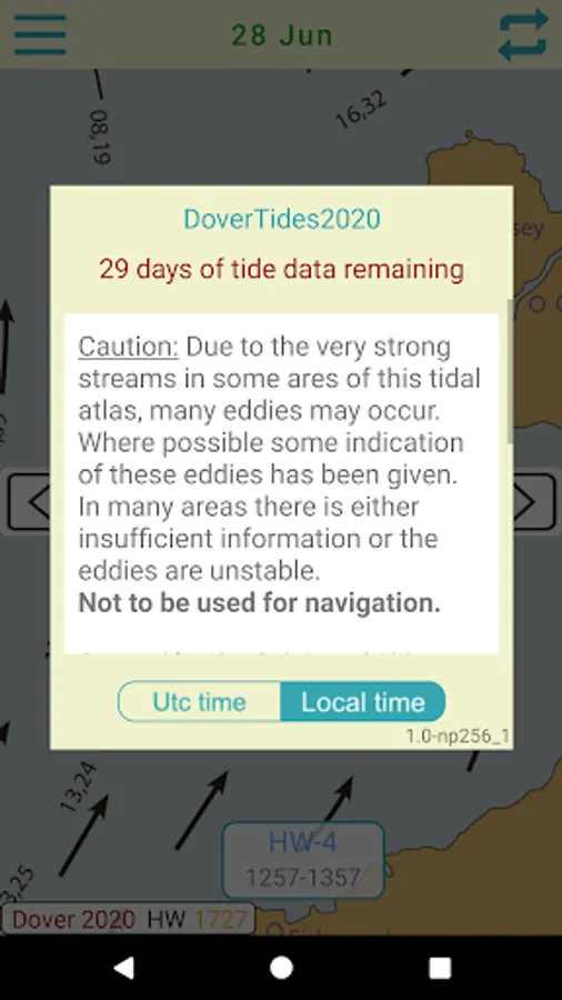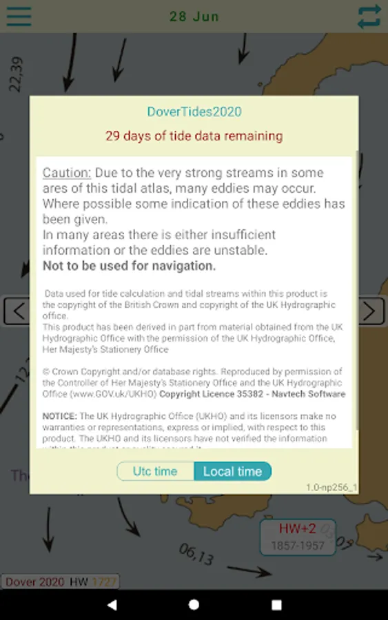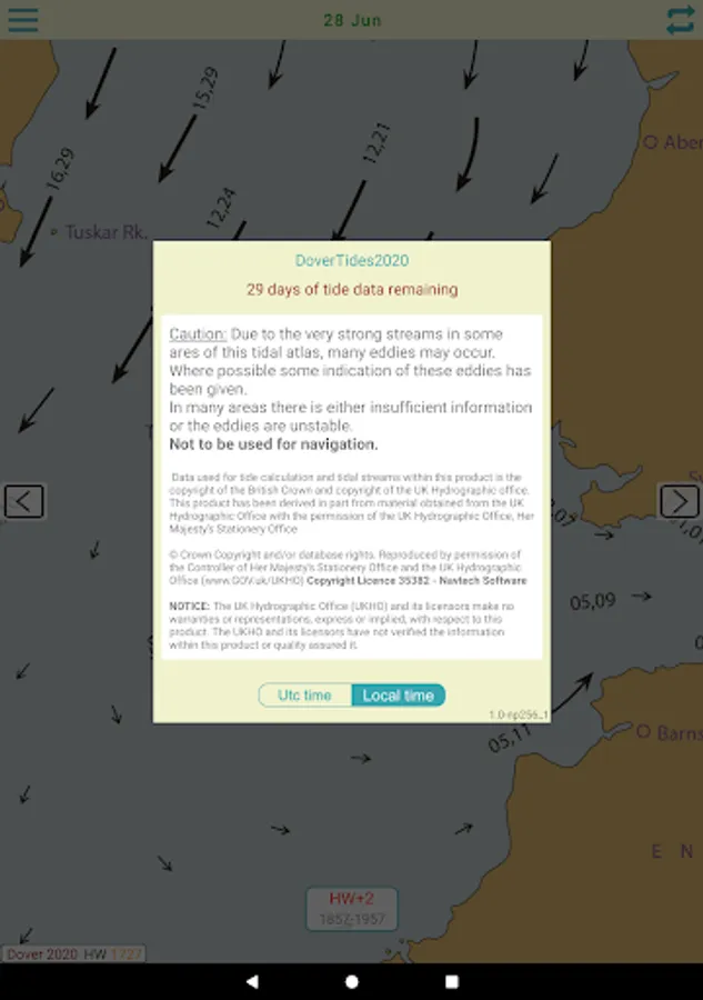 The nearest Dover HW time to the actual time is selected from the database and the relevant streams chart is displayed, together with the time period for which the chart is valid.