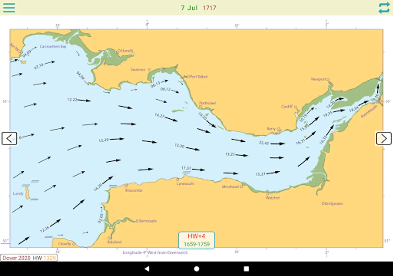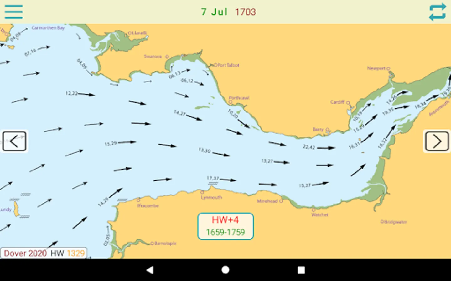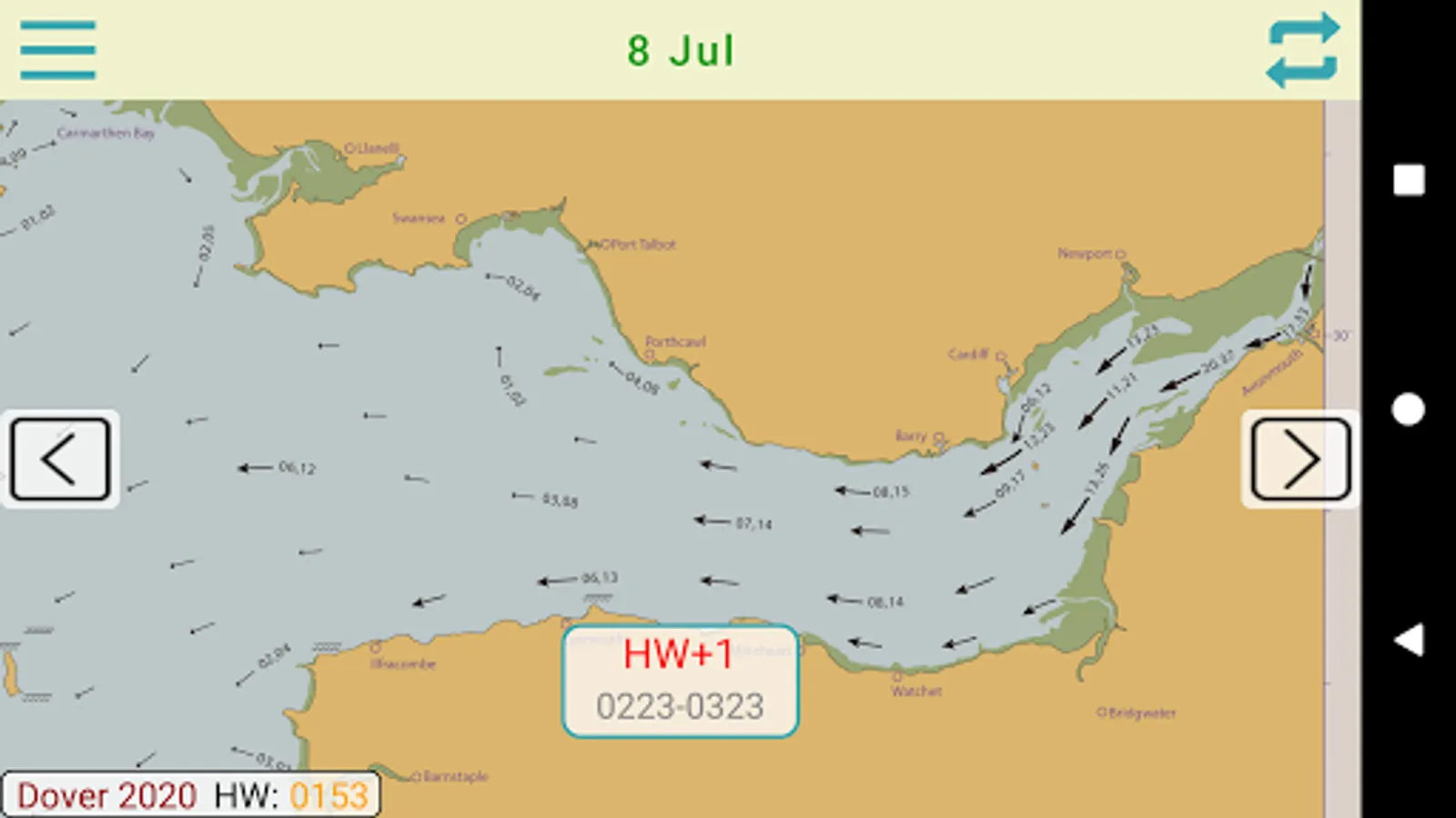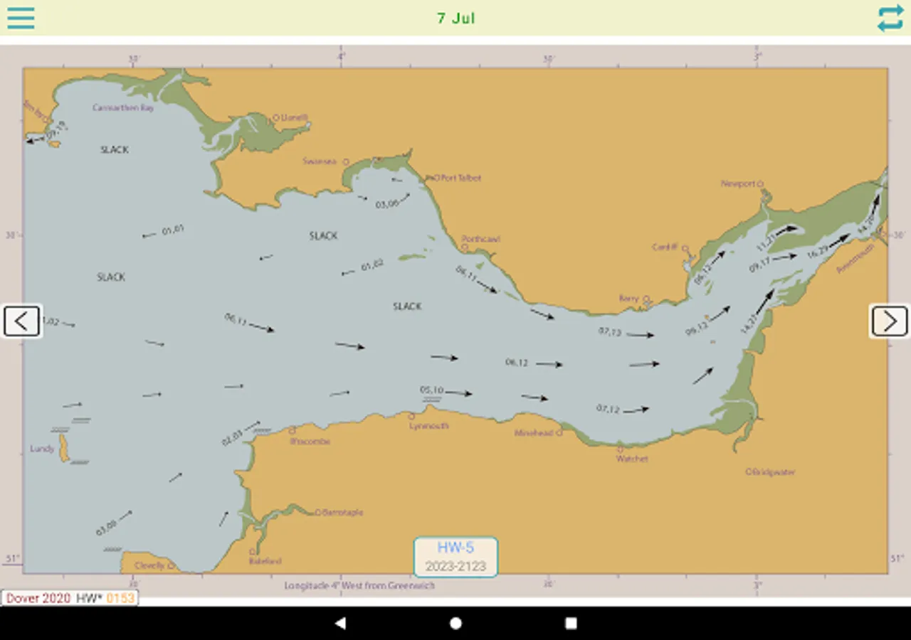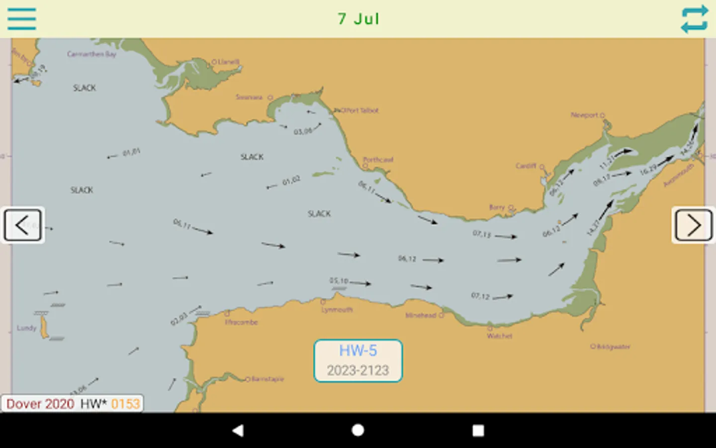 The app automatically selects the nearest Dover HW time of the day, but if you want to see data for the next or previous HW of the day, swipe forward or back to advance the tidal hour.