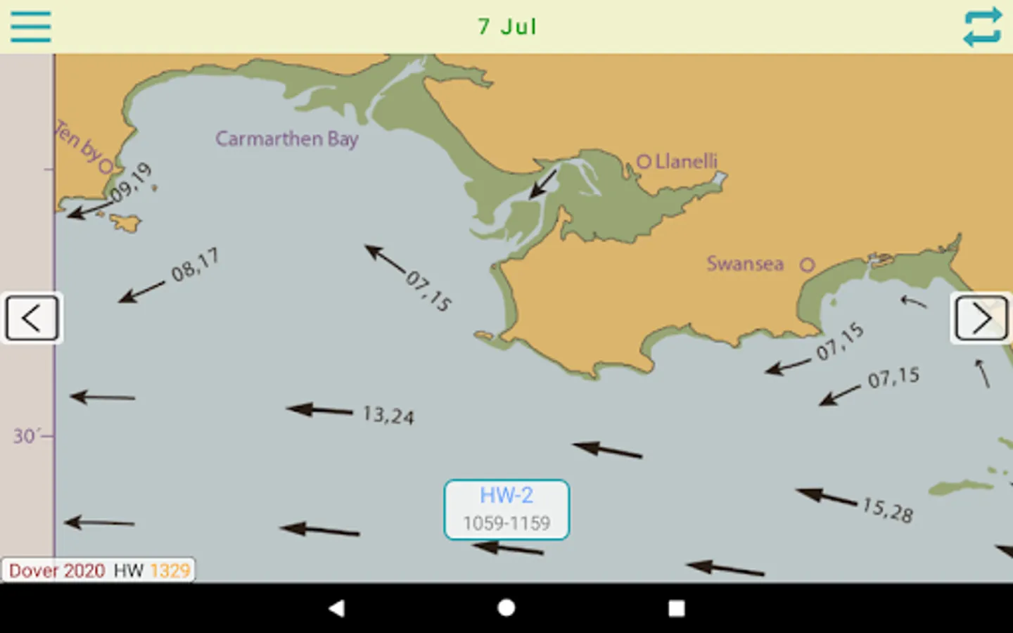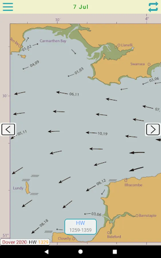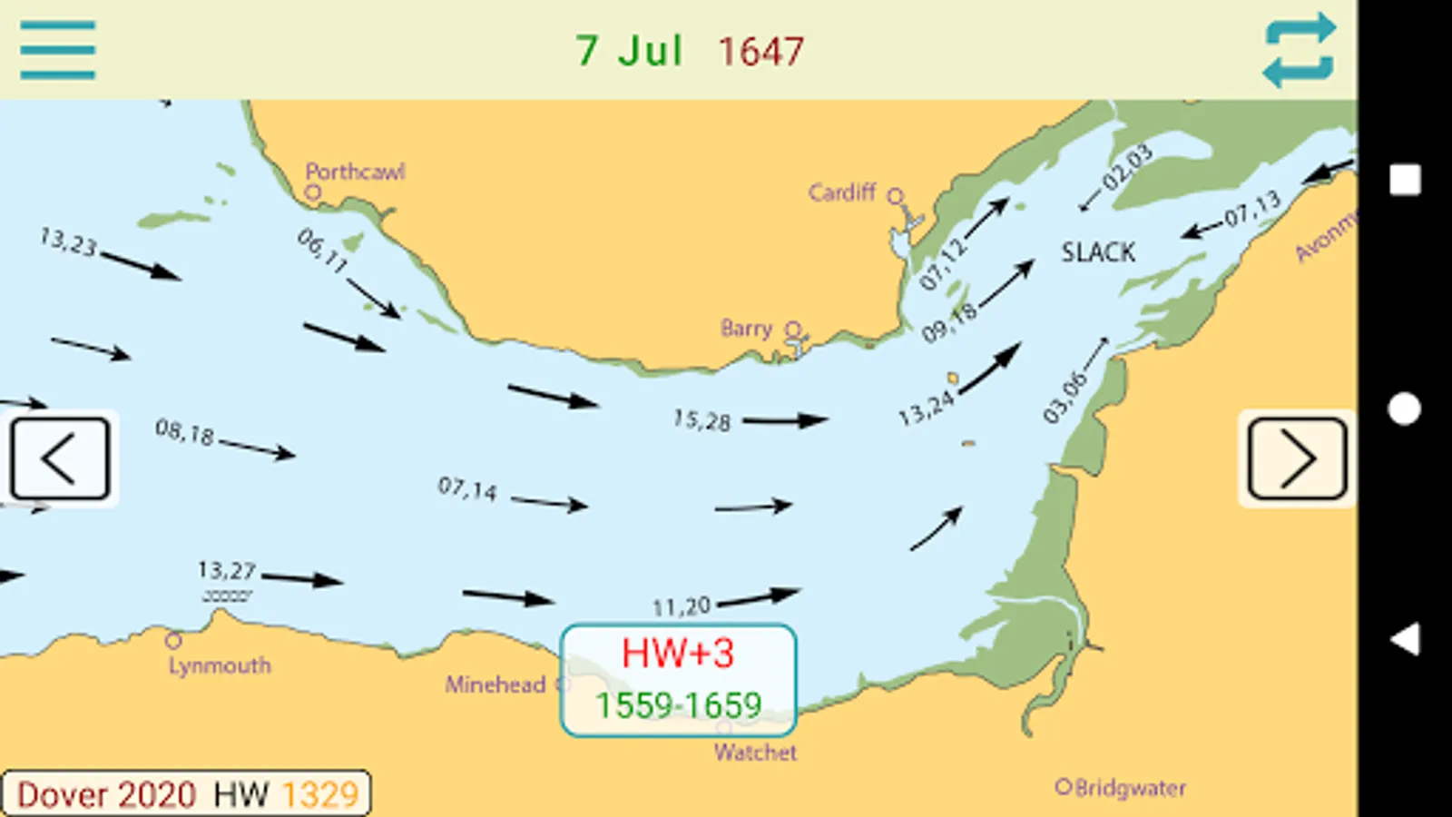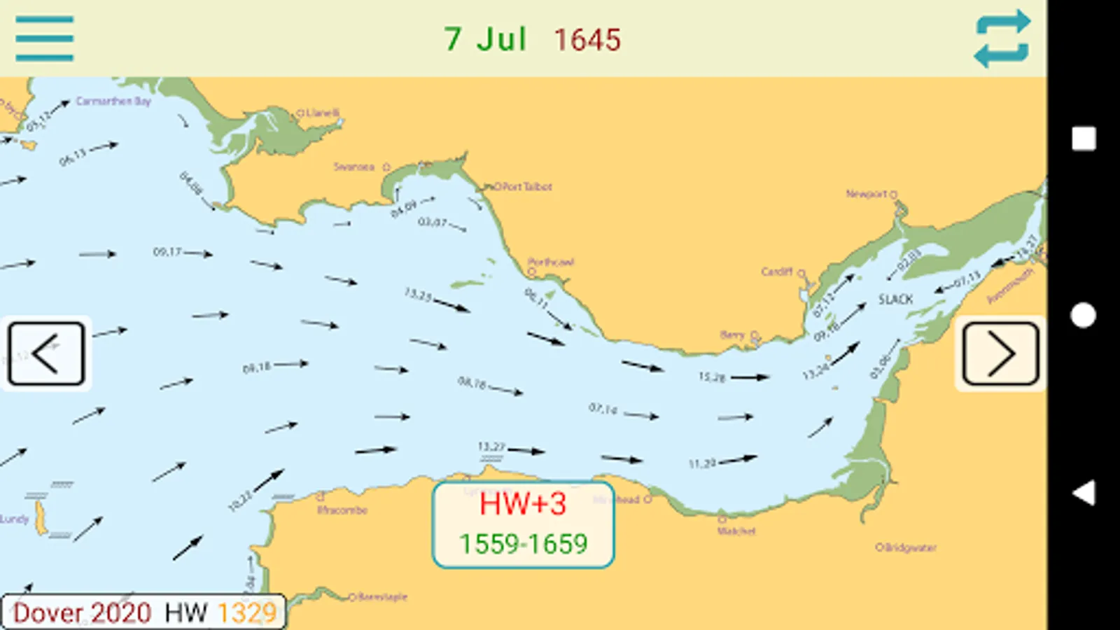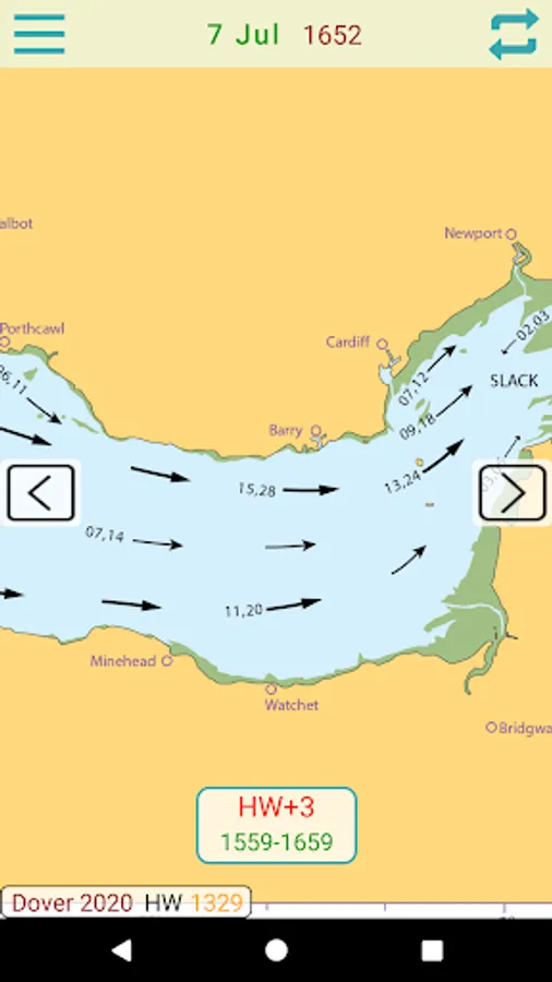 The app automatically selects the nearest Dover HW time of the day, but if you want to see data for the next or previous HW of the day, swipe forward or back to advance the tidal hour.