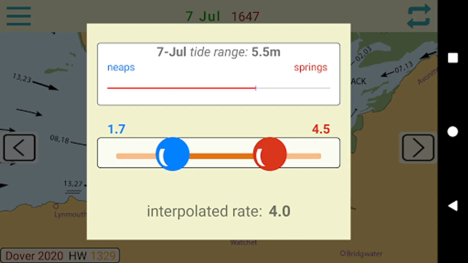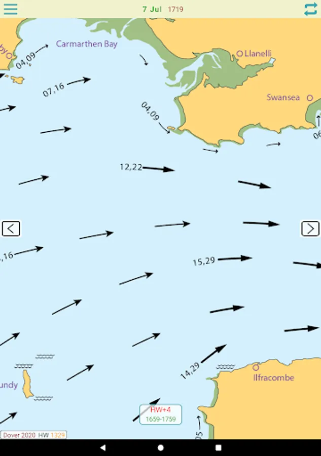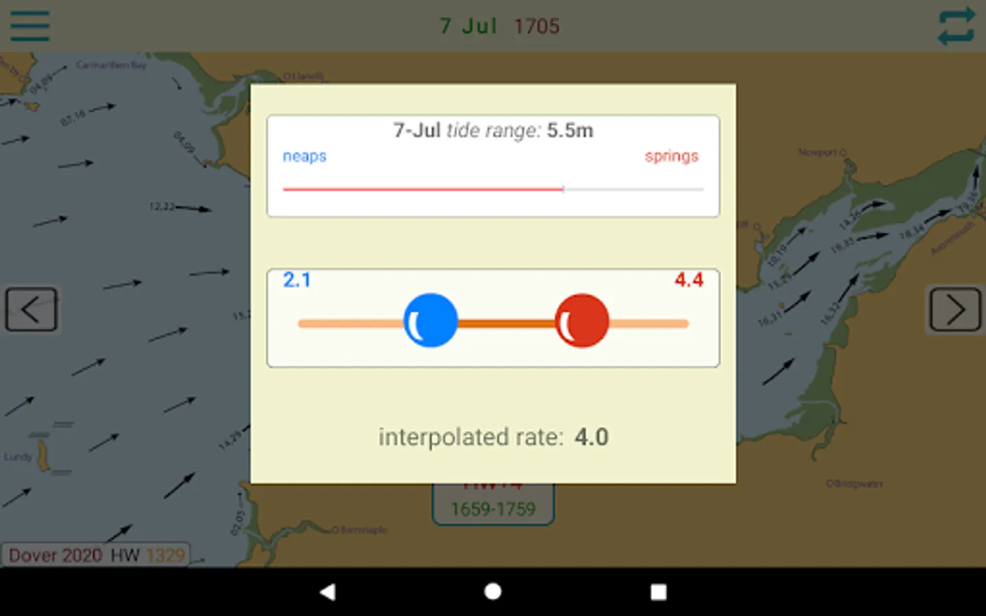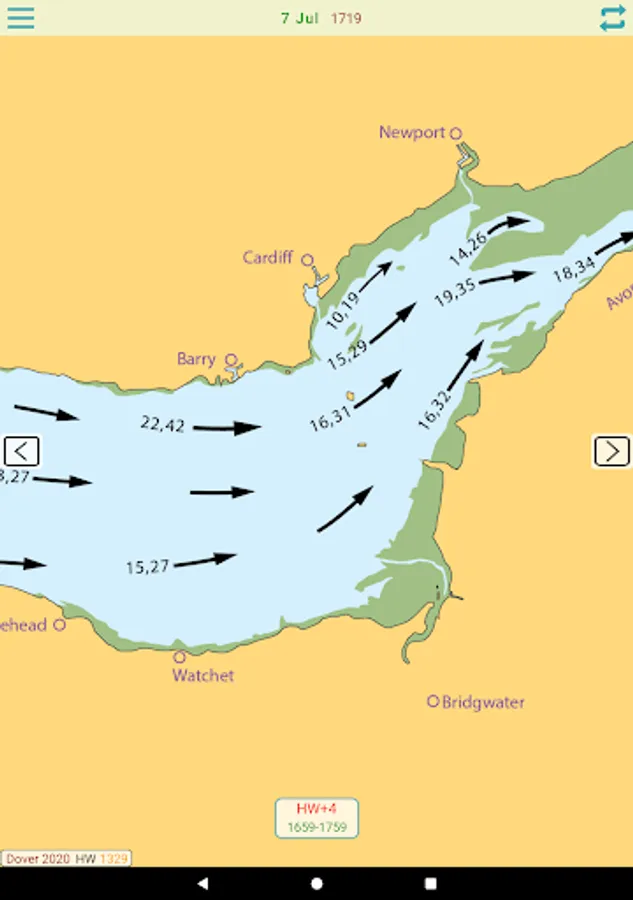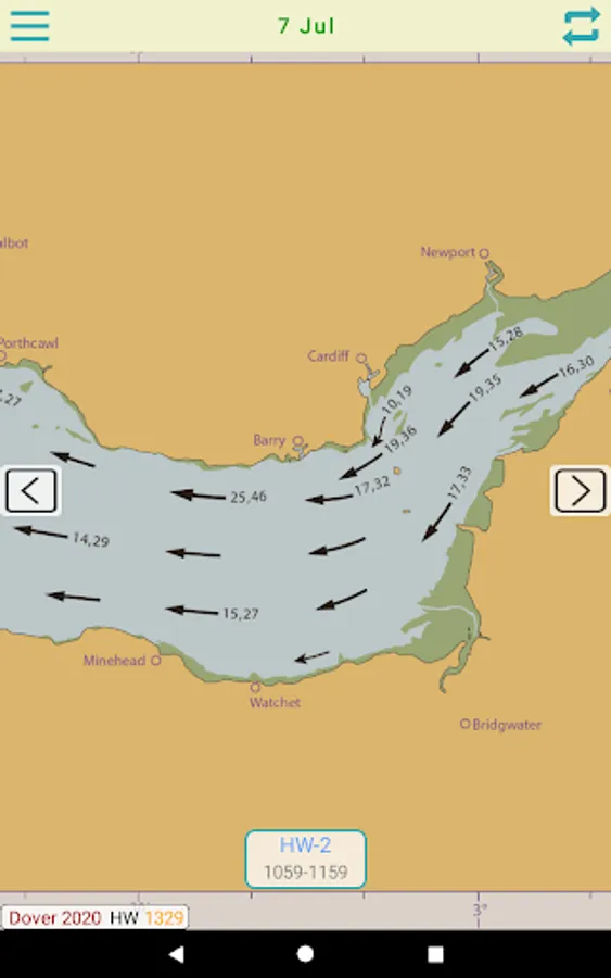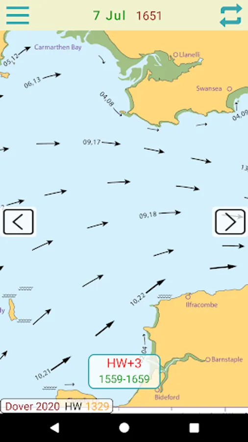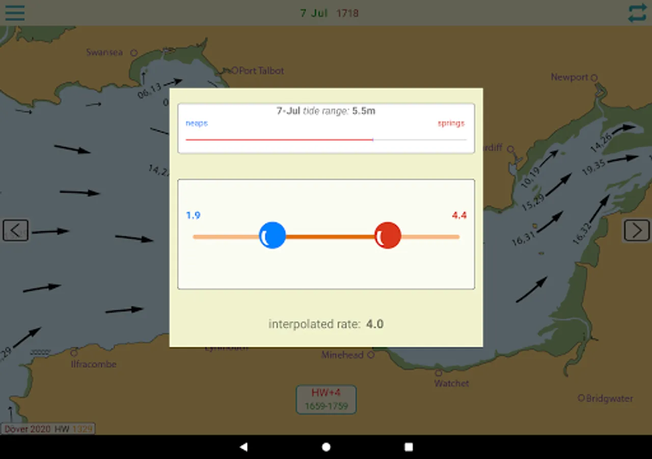 The app automatically selects the nearest Dover HW time of the day, but if you want to see data for the next or previous HW of the day, swipe forward or back to advance the tidal hour.