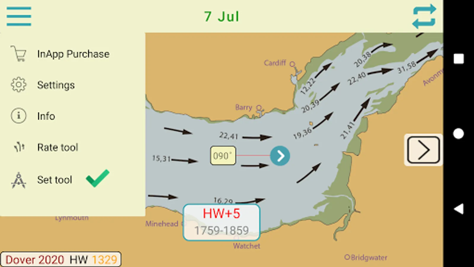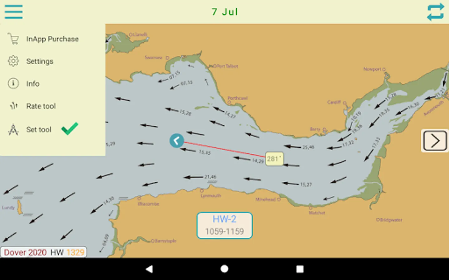 Select the 'Set' tool to measure the precise true course of any tidal stream arrow. (in-app purchase)