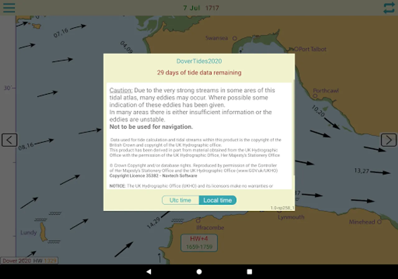 The nearest Dover HW time to the actual time is selected from the database and the relevant streams chart is displayed, together with the time period for which the chart is valid.