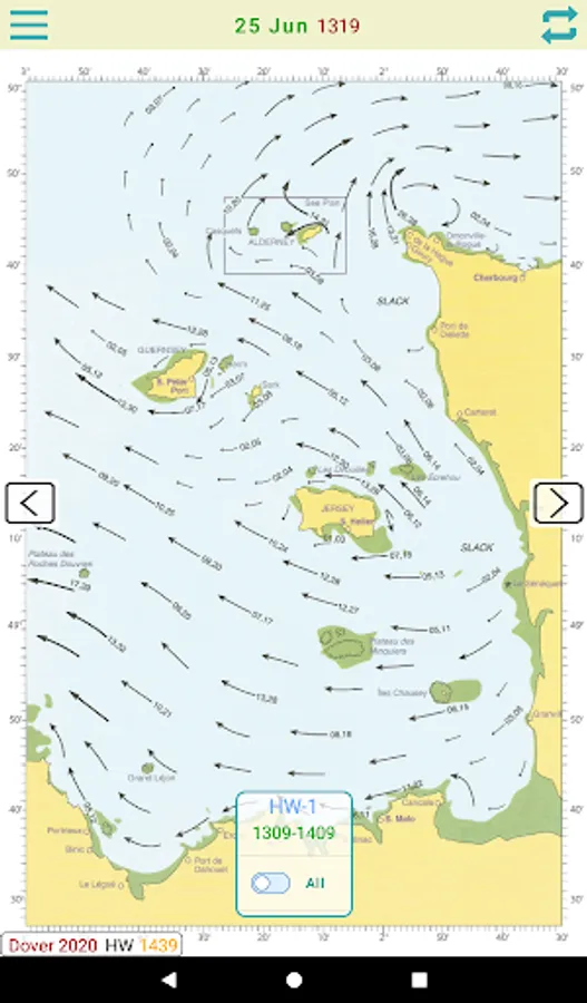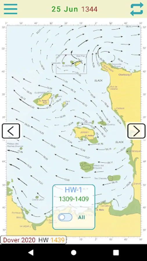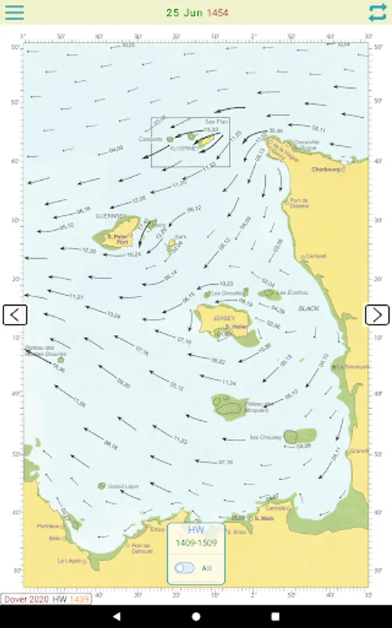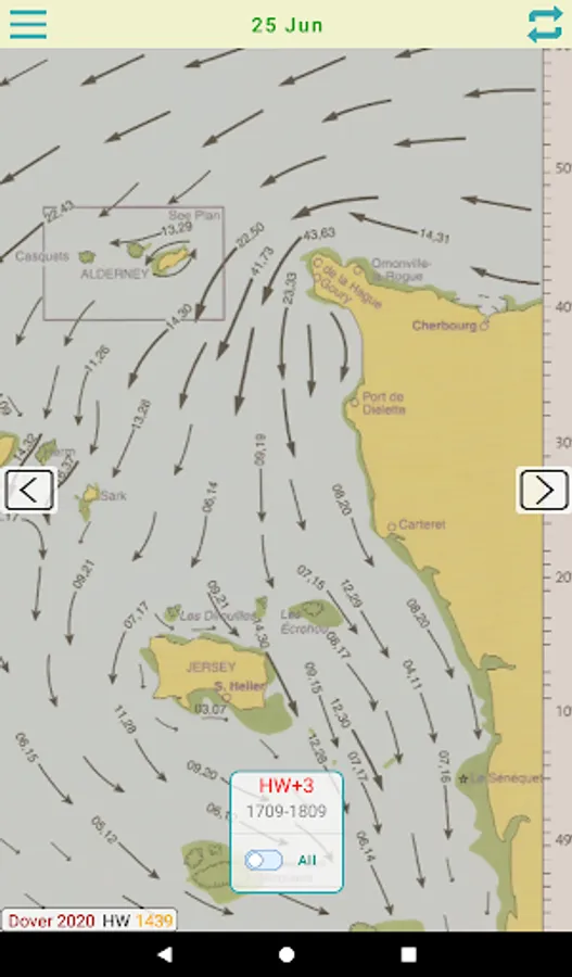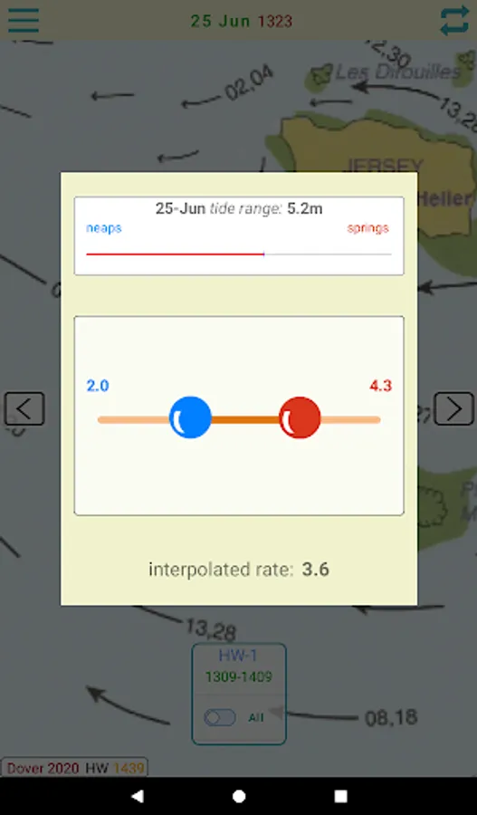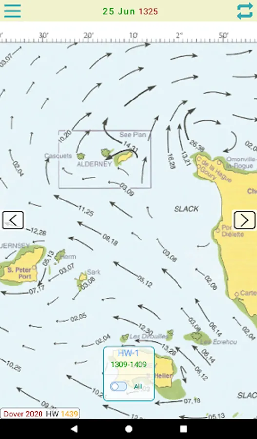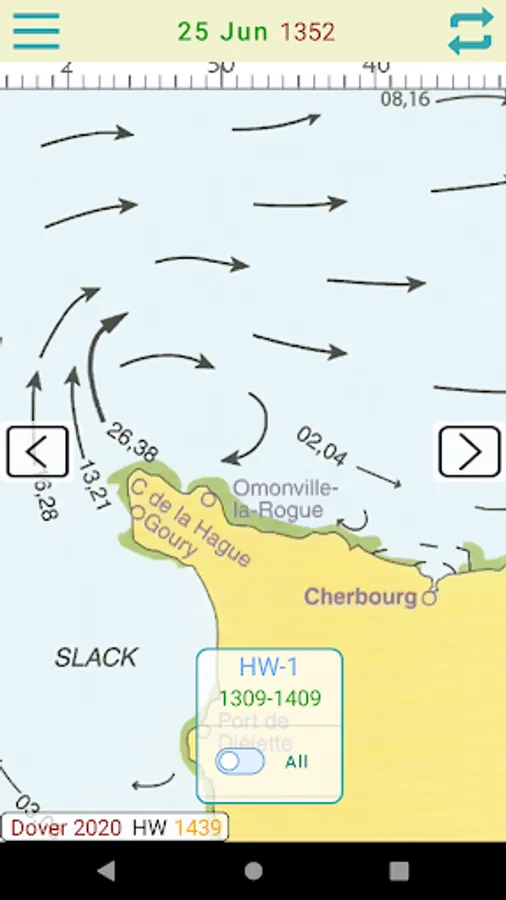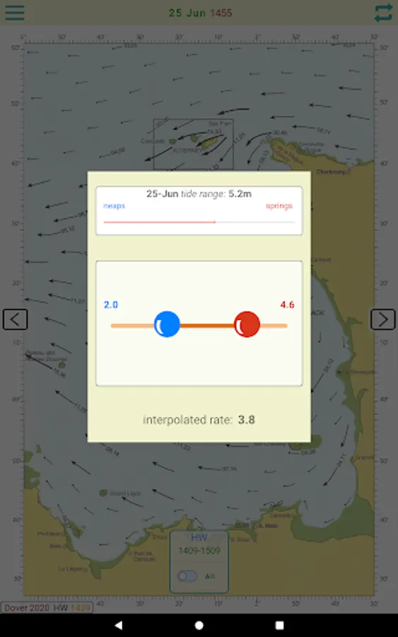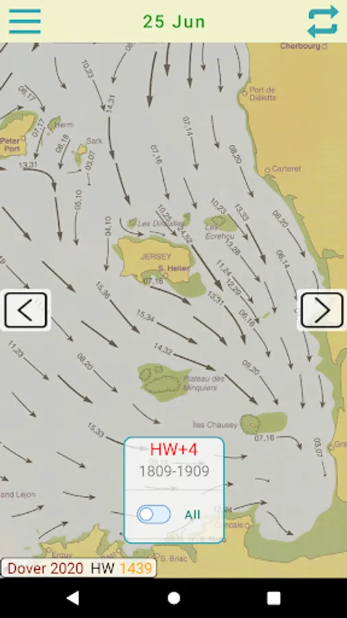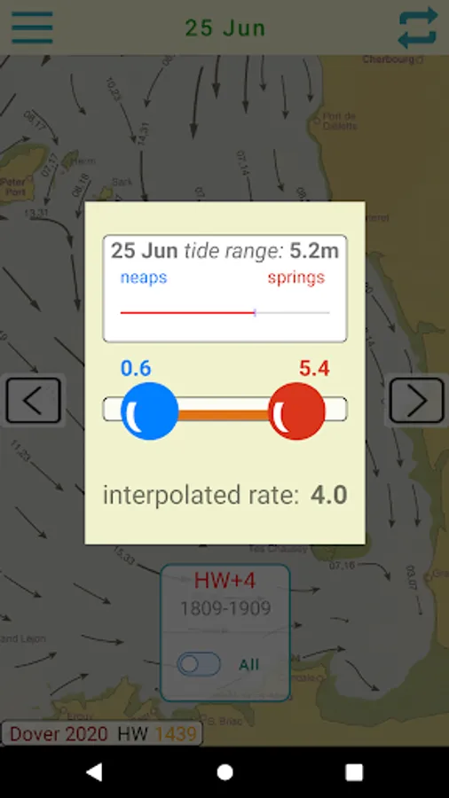 The app automatically selects the nearest Dover HW time of the day, but if you want to see data for the next or previous HW of the day, swipe forward or back to advance the tidal hour.