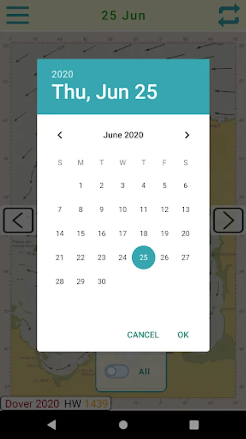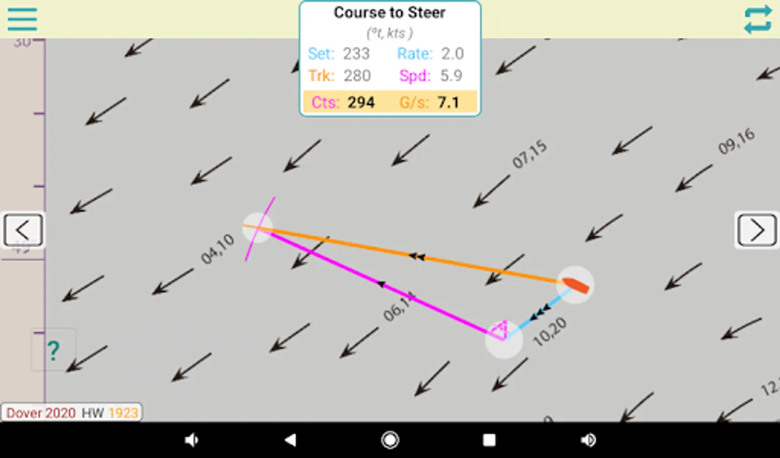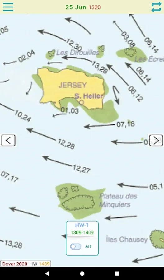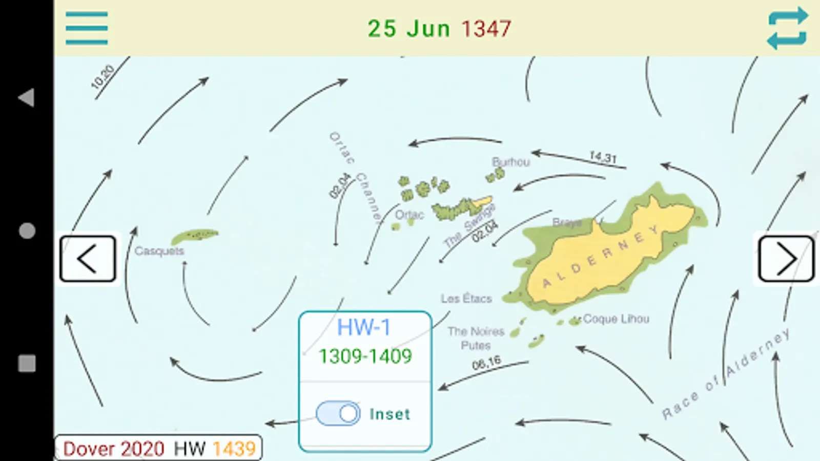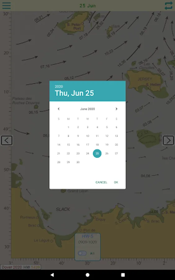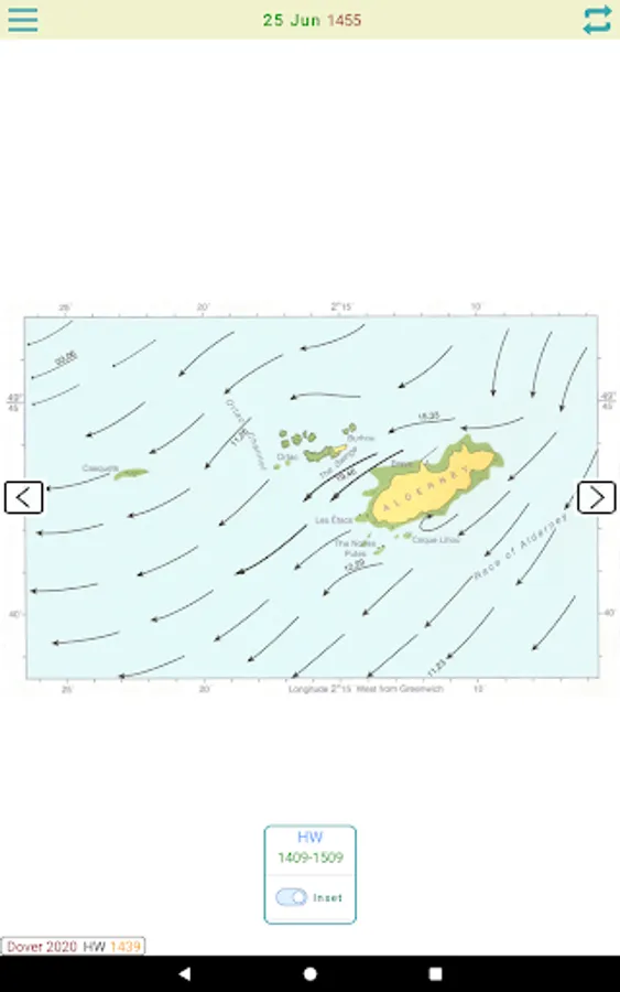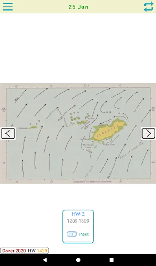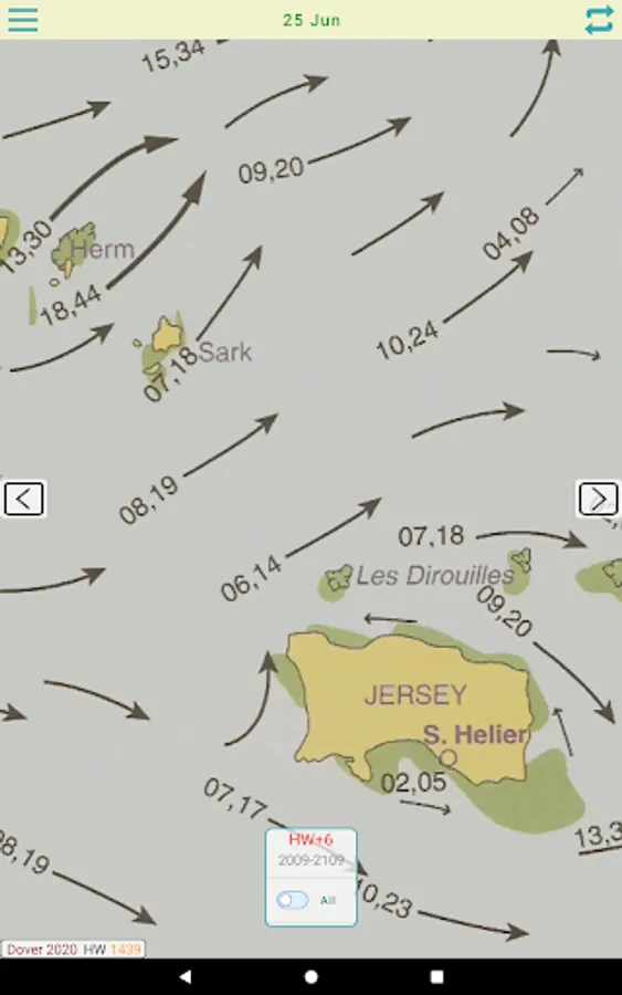 The app automatically selects the nearest Dover HW time of the day, but if you want to see data for the next or previous HW of the day, swipe forward or back to advance the tidal hour.