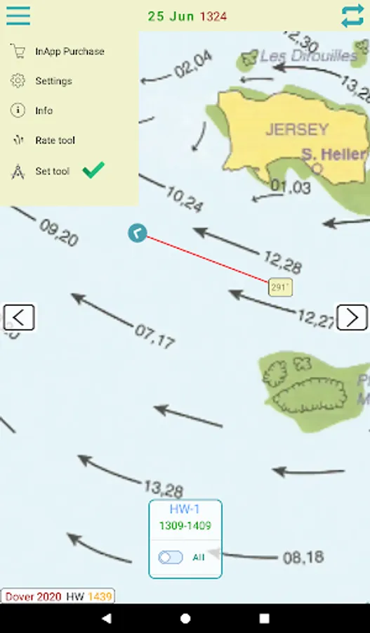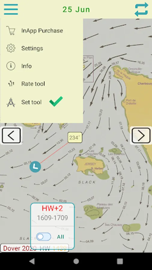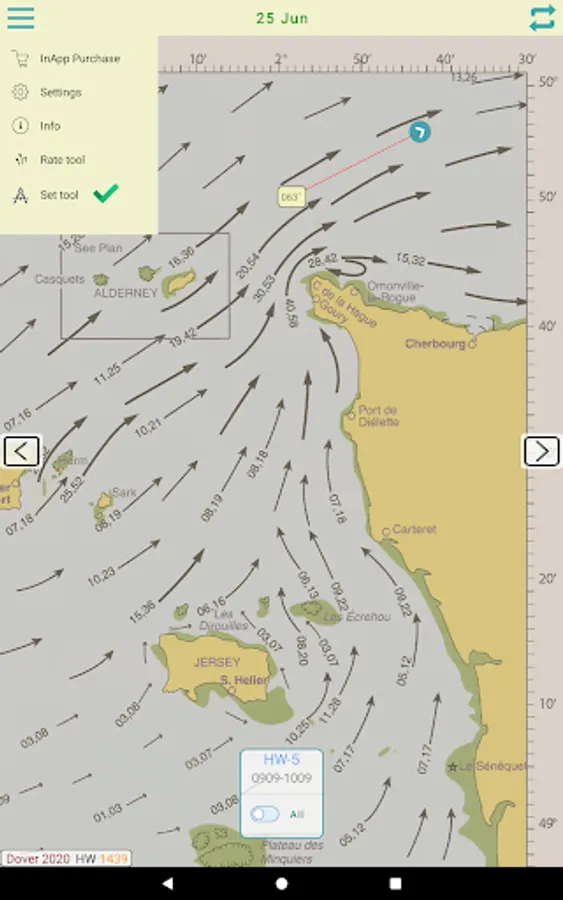 Select the 'Set' tool to measure the precise true course of any tidal stream arrow. (in-app purchase)