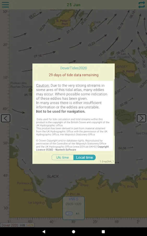 The nearest Dover HW time to the actual time is selected from the database and the relevant streams chart is displayed, together with the time period for which the chart is valid.