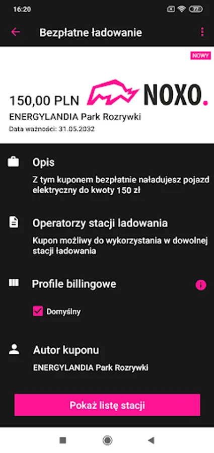 Thanks to the NOXO app. you will charge your electric car. Install the app, open an account, find a station and charge your electric car. Pay with credit card. Lower your charging costs by using coupons. Control your business expenses thanks to the use of billing profiles.