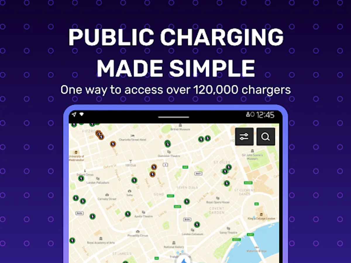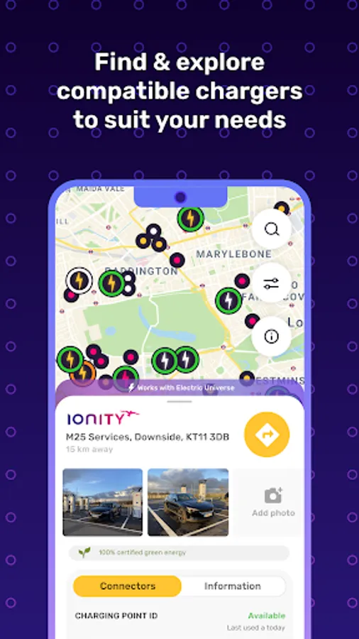 * Detailed Charger Information - Shows live charger availability, a renewable energy icon to help you charge with 100% green energy, and important location details (such as charging costs and other parking restrictions).