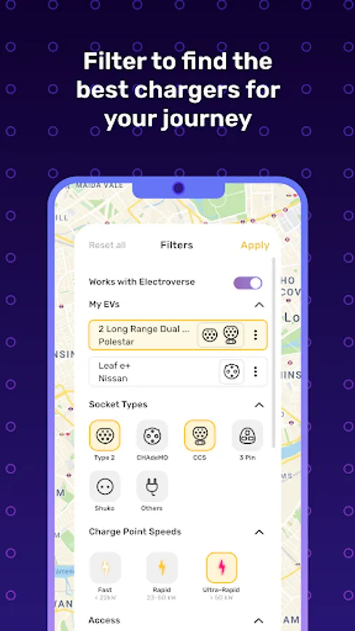 * Map filters - Search for Electroverse charging stations near you via charging speeds, socket types and networks.