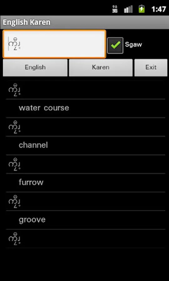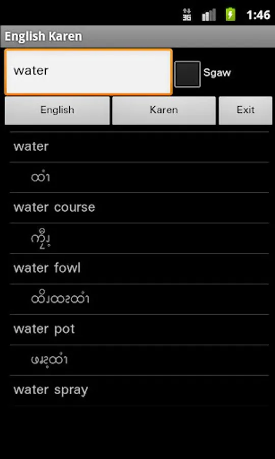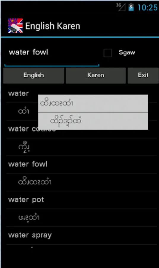 English Karen Dictionary – travel dictionary to translate English to Karen displaying a list of words in Karen (Sgaw or Pwo). The dictionary also translates from Karen to English. Copying a word from the translated list for a reverse translation can be used to find synonyms and to understand the broader use of the Karen word in the English language. Although the English Karen dictionary does not provide definitions or examples, the use of the translation software in this way provides you with a mechanism to better understand Karen words in the English context without the need for definitions. 15K references.