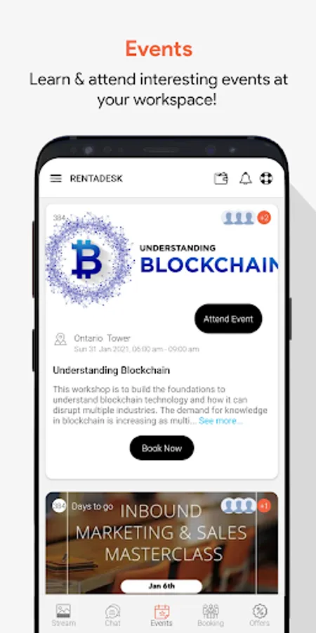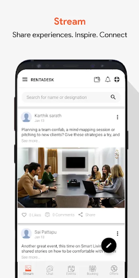 RENT A DESK app helps members share their personal experiences, collaborate with each other, book meeting rooms conveniently and avail member only discounts.