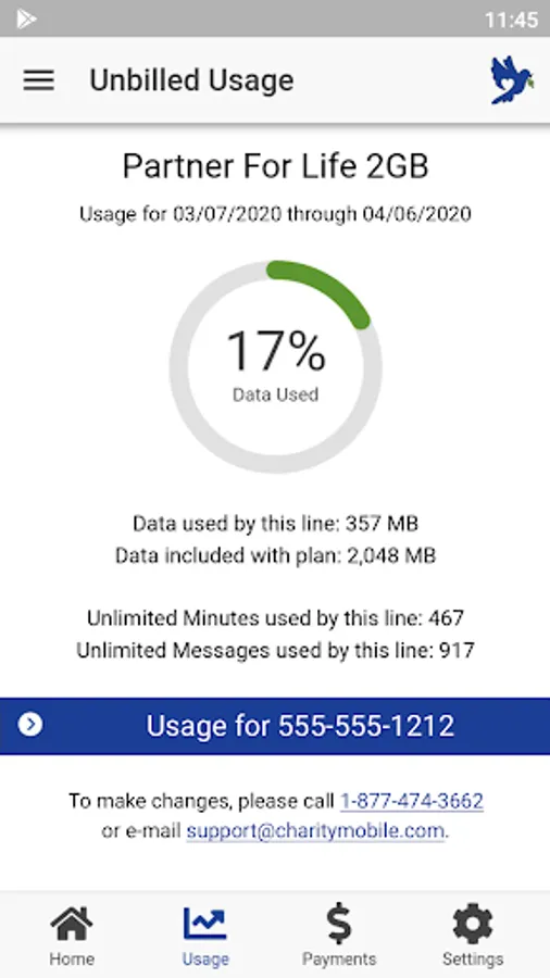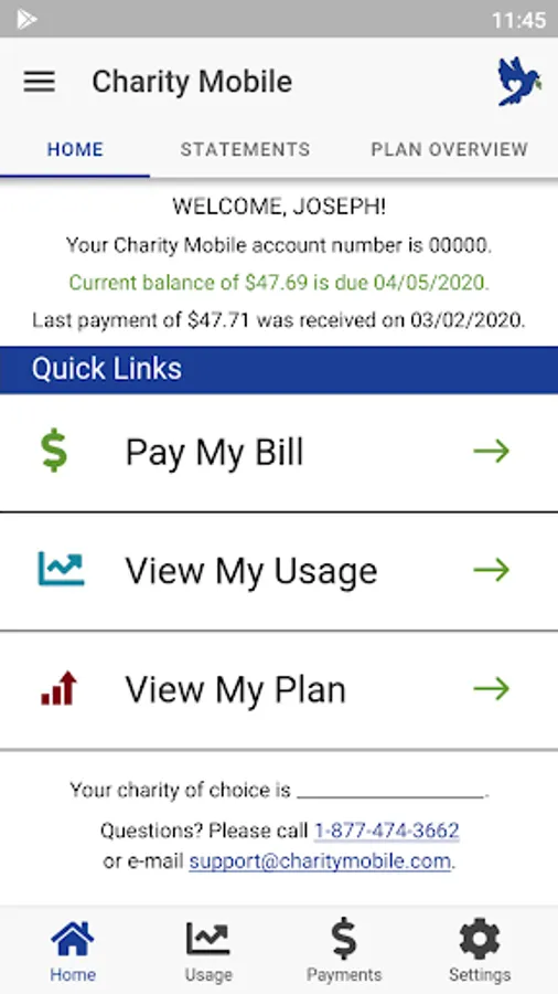 Use our free Charity Mobile app to manage your Charity Mobile account from your smartphone. You can track your monthly usage, pay your bill, manage your payment methods, view your plan, and more.