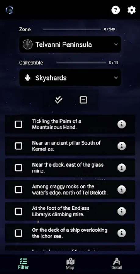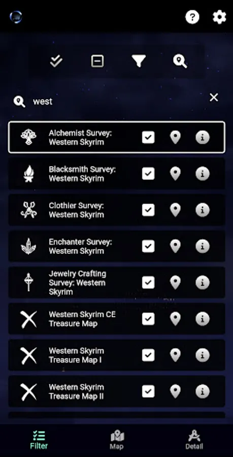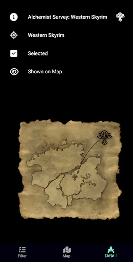 Items can be located on their respective zone maps and ticked off as they are completed. Treasure map and survey detail can be viewed for each item as you hunt to save you time opening and closing your inventory. You can also find missing Mages Guild books and Skyshards while completing surveys.