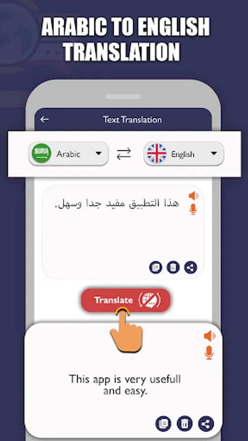 ★English Arabic Translator UI: For fast translation to Arabic language Arabic Translator has simple - friendly user interface.