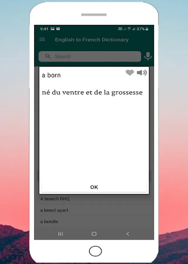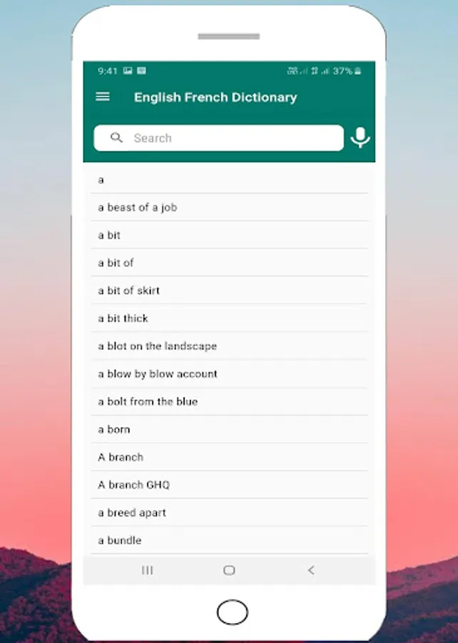 The best French Dictionary is here where you can easily search any words you are seeking for. We can also name the dictionary as English French Dictionary or French English Dictionary . This is not only a dictionary but also a learning tool . You can use it without Internet and carry a big dictionary wherever and whenever you go in jut a small smart phone. Translator and text to speech is also available for the users . When you start typing, you will see some words starting with the letters you typed. This application will be helpful to any students or non students etc to find out the meaning of any word.