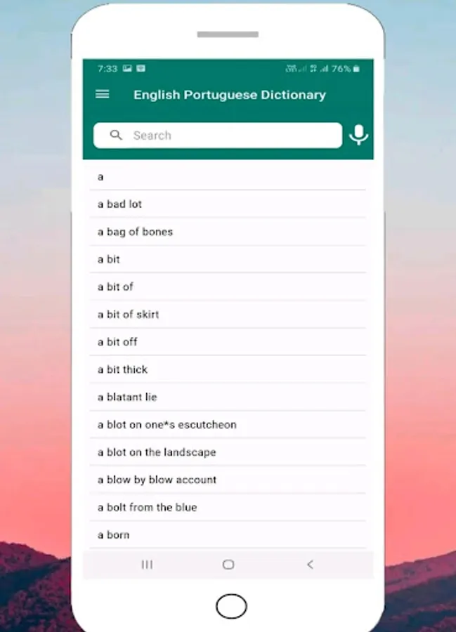 The best Portuguese Dictionary is here where you can easily search any words you are seeking for. We can also name the dictionary as English Portuguese Dictionary or Portuguese English Dictionary . This is not only a dictionary but also a learning tool . You can use it without Internet and carry a big dictionary wherever and whenever you go in jut a small smart phone. Translator and text to speech is also available for the users . When you start typing, you will see some words starting with the letters you typed. This application will be helpful to any students or non students etc to find out the meaning of any word.