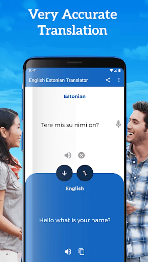 Are you looking for Estonian translator or Estonian to English translation app, With this app, you can translate Estonian voice or Estonian texts into English, or translate English voice and text into Estonian. this is the best Estonian translator app into English.
