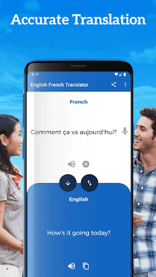 French English translator - free dictionary app, is the best app for French or English translation. Our fast translator application allows you to translate your voice, text and sentences from English to French or French to English.