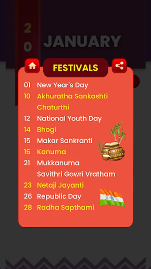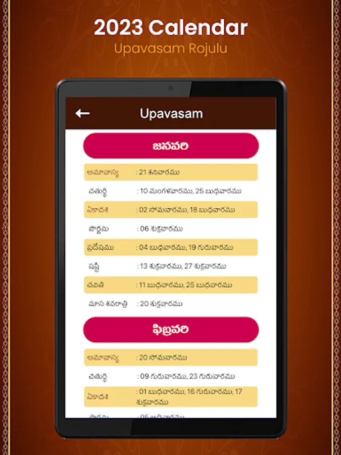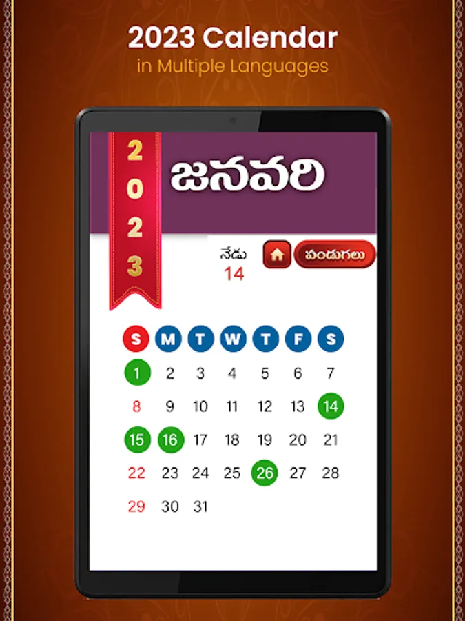 Calendar 2023 in English gives all the important information about Indian panchangam, hindi panchangam, Upavasam(Pasting) dates, Muhurat 2023: all important muhurats like naming Govt holidays, ceremony dates, marriage Muhurat / Vivah muhurat, vehicle purchase, property purchase, gruha pravesh dates for the new year 2023 available in this Calendar 2023 app.