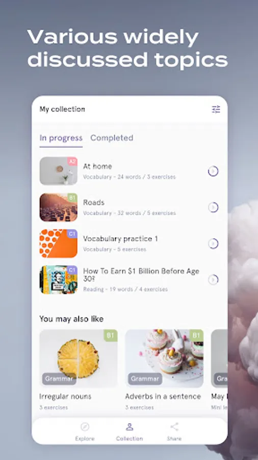 At the same time this app will be a good assistant for you during your offline curriculum. But unlike large English course books, this app doesn’t require a lot of space in your bag. Everything you need for studying is in your pocket: learn something new and do exercises right after.