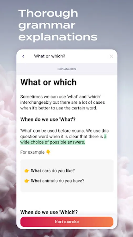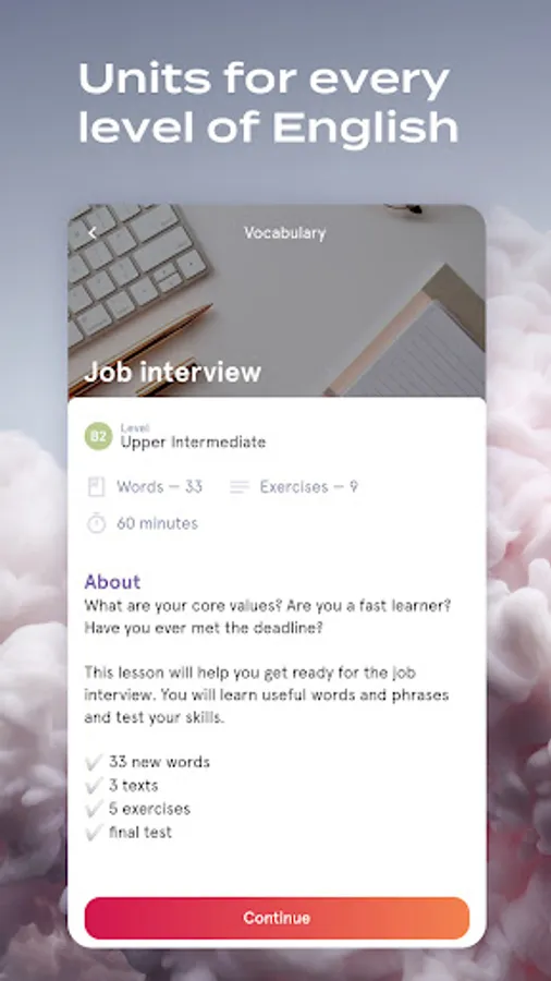 «English Grammar and Vocabulary» is a new rapidly developing app. Each week learners get new useful and engaging units with tests and exercises. Also, we embed tools and features that make the app’s functionality clear and easy to use.