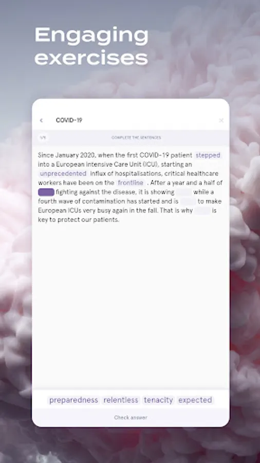 This application is an efficient way to learn English. It provides lots of tests and exercises in each unit. You can choose whether you want to learn grammar or new vocabulary today.