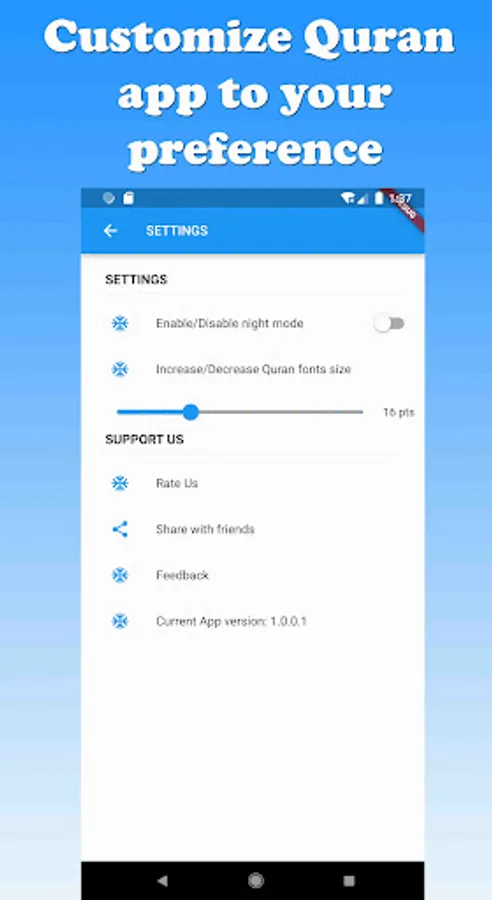 - Set your Qur'an preferences either for the 'Night Mode' light mode and different font sizes to make reading the glorious Quran easy on your eyes.