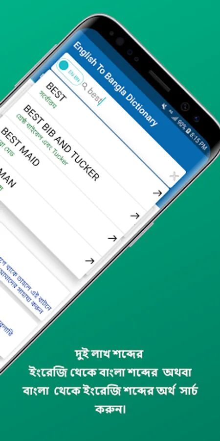 ইংলিশ টু বেঙ্গলি অভিধান অ্যাপটি অ্যান্ড্রয়েডের জন্য দুই লাখের ও বেশি নির্ভরযোগ্য বেঙ্গলি অর্থ, সংজ্ঞা, প্রতিশব্দ এবং উদাহরণ সহ অ্যান্ড্রয়েডের জন্য শীর্ষস্থানীয় অভিধান অ্যাপ।