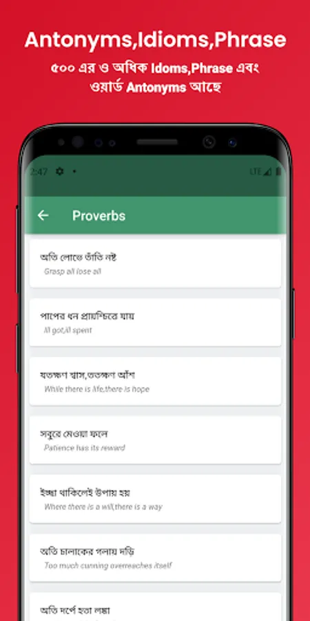 প্রবাদ ও প্রবচন – এই ইংলিশ টু বেঙ্গলি অভিধানে অনেক প্রবাদ ও প্রবচন রয়েছে যাতে সহজে শিখতে পারেন