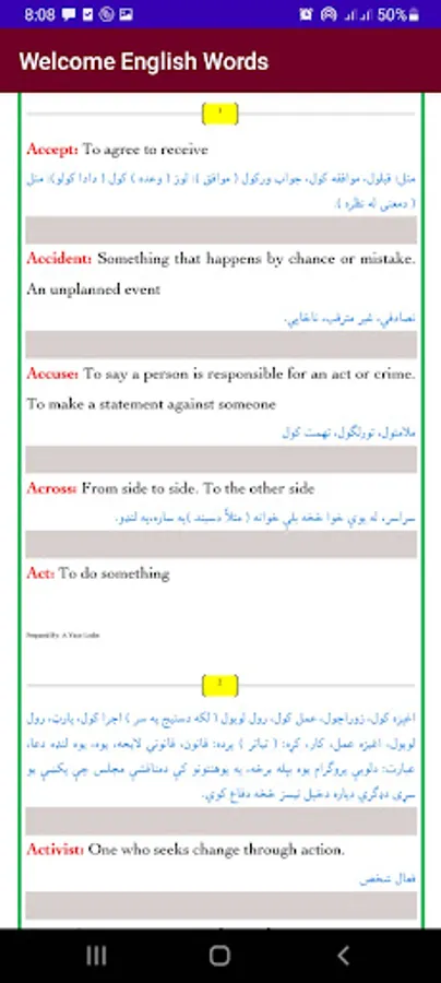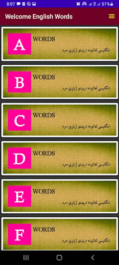 محترمو افغانانو وروڼو، پښتو ژبي ته د خدمت په پار زه احمد یاسر لودین تاسو ته د انګلیسي یوولسوه لغاتونه د پښتو ژباړي سره یوځای د آپلیکېشن د لاري وړاندي کوم، چي ټول لغاتونه په ترتیب سره په کښي ځای پر ځای سوي دي، هیله ده د خوښۍ وړ مو و ګرځي.
