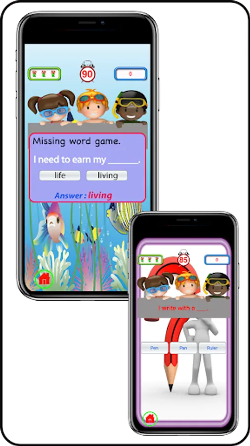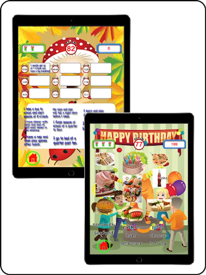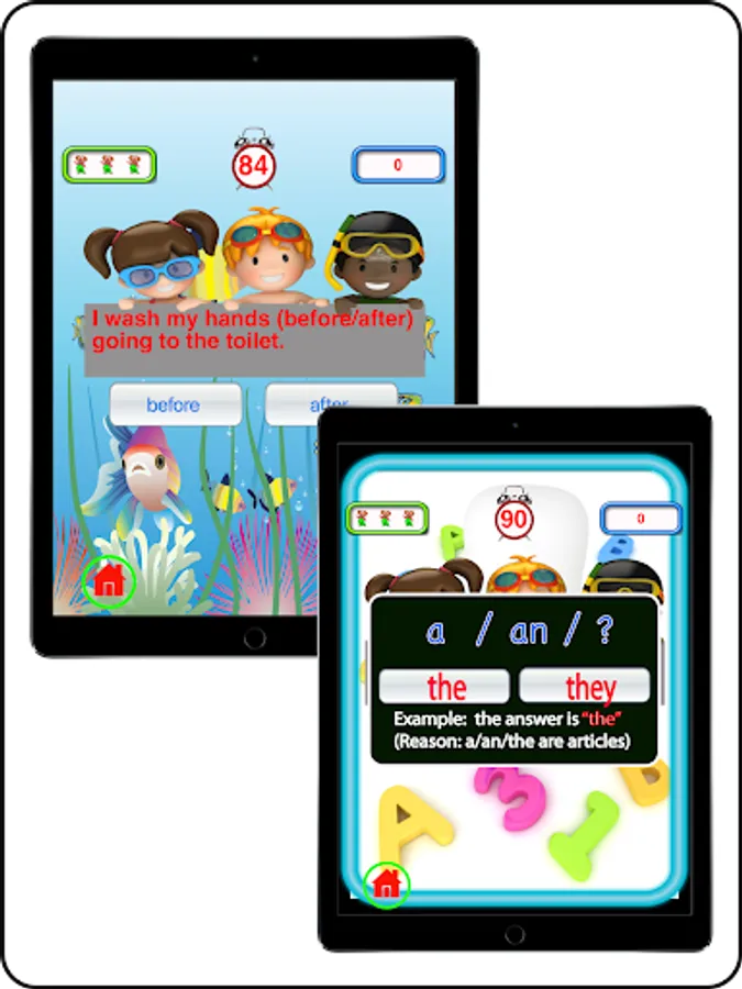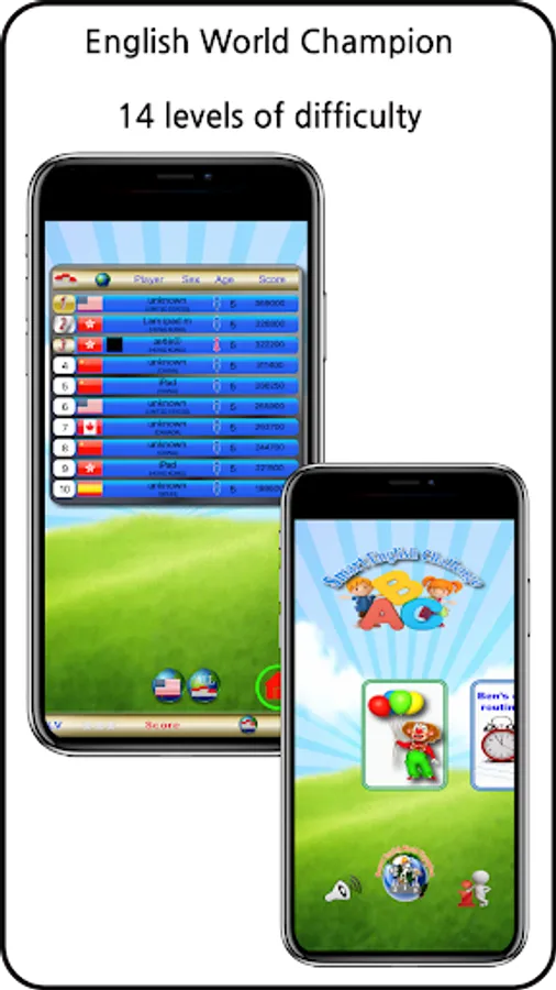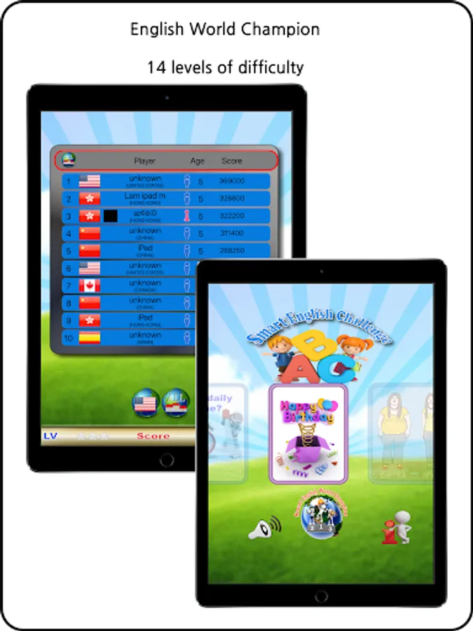 Smart English World Champion: In this mode you race online against other children from around the world. The total score is summed up by your highest score in each level. The app has a total of 11 levels of difficulty.