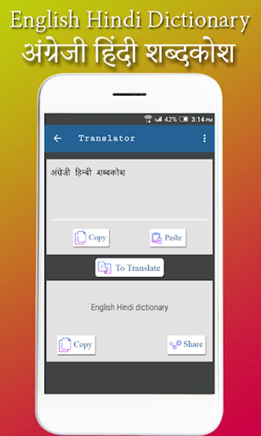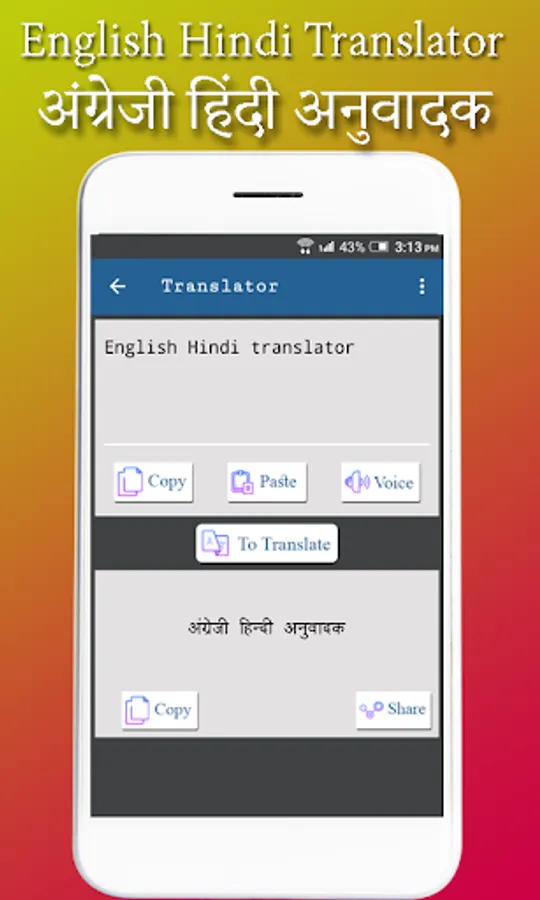 Now translate from Hindi to English or English to Hindi, using your android mobiles with this easy translator app. Just get English Hindi Translator app downloaded in your mobile and start translating. Its a easy to use app with beautiful User Interface Design.