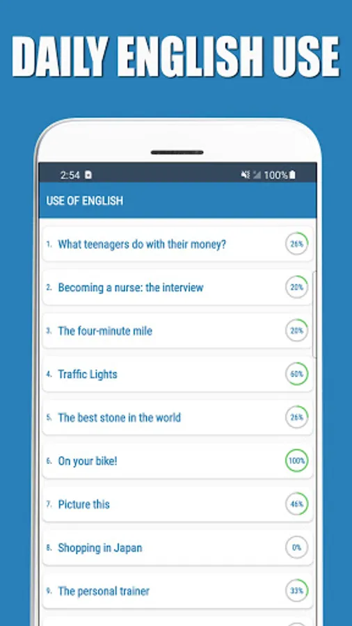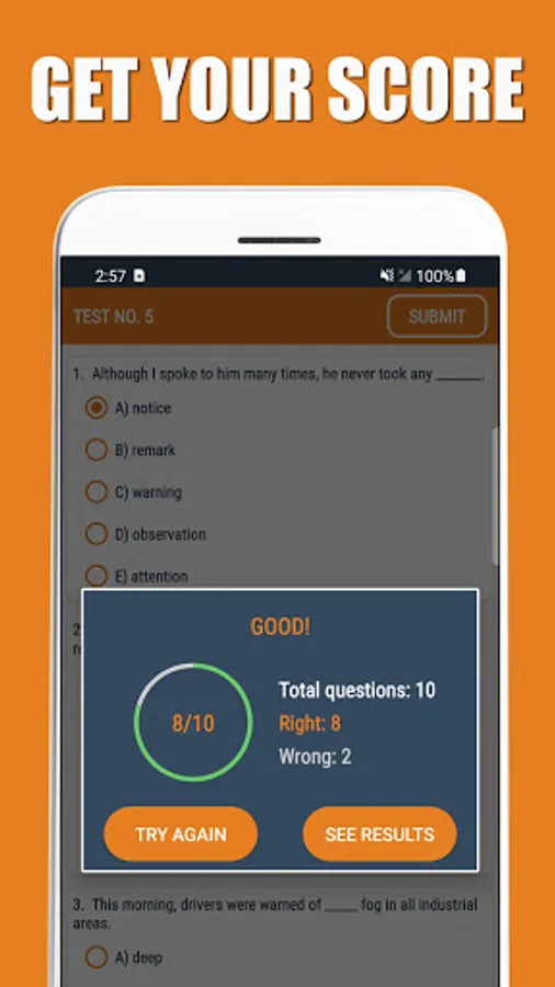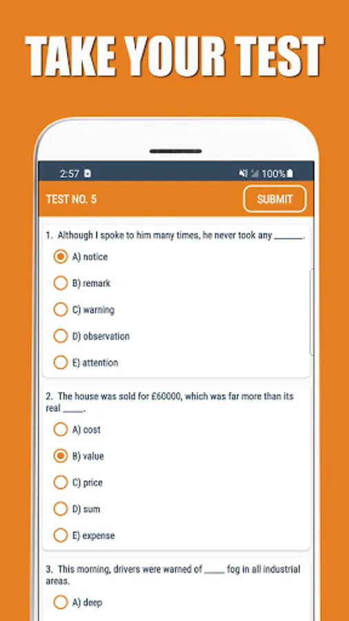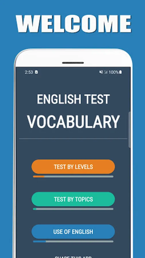 The most effective way of improving your English vocabulary is to practice a little bit everyday. Vocabulary Master Test application is designed to help you easily practice on your phone.