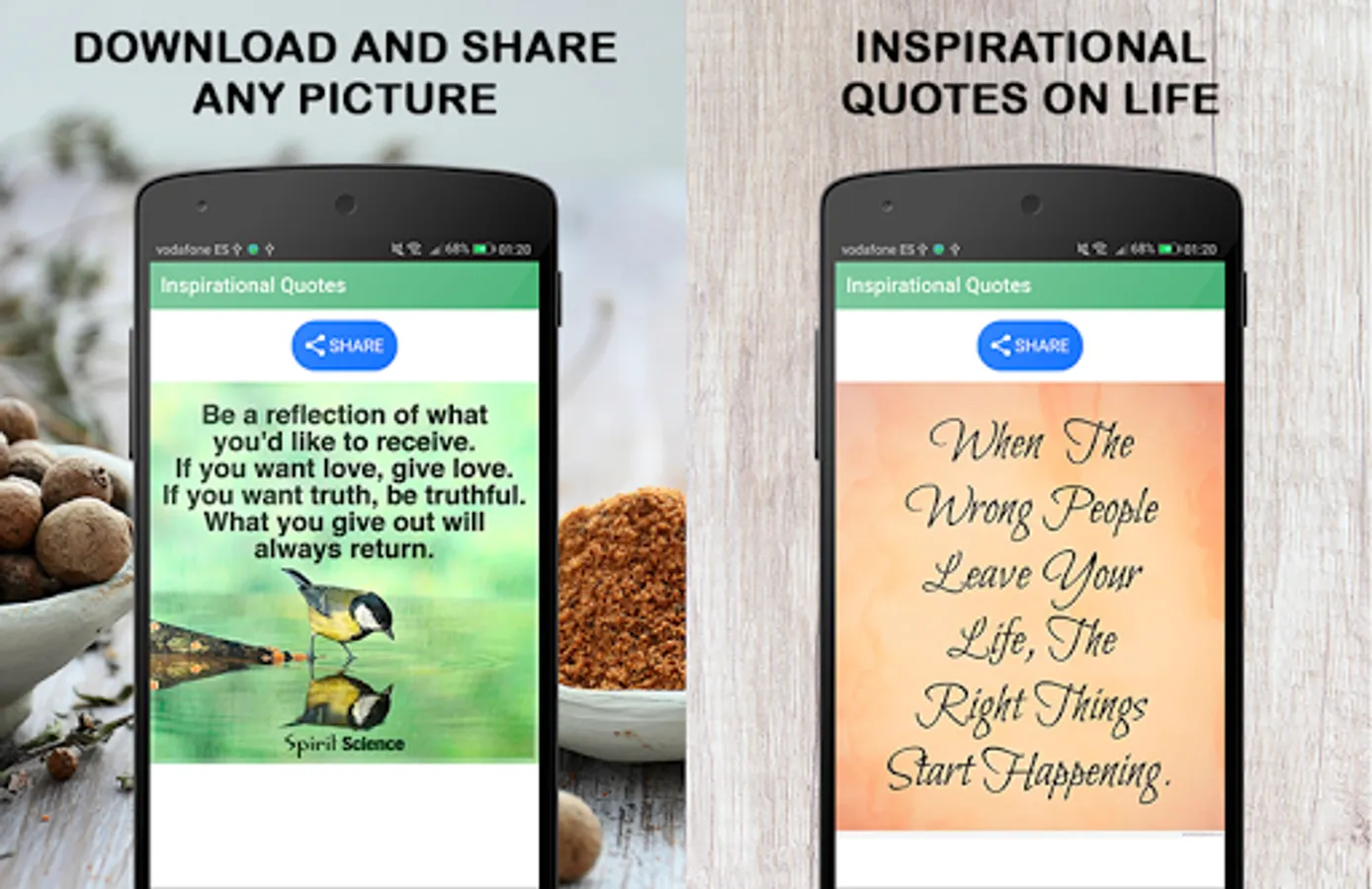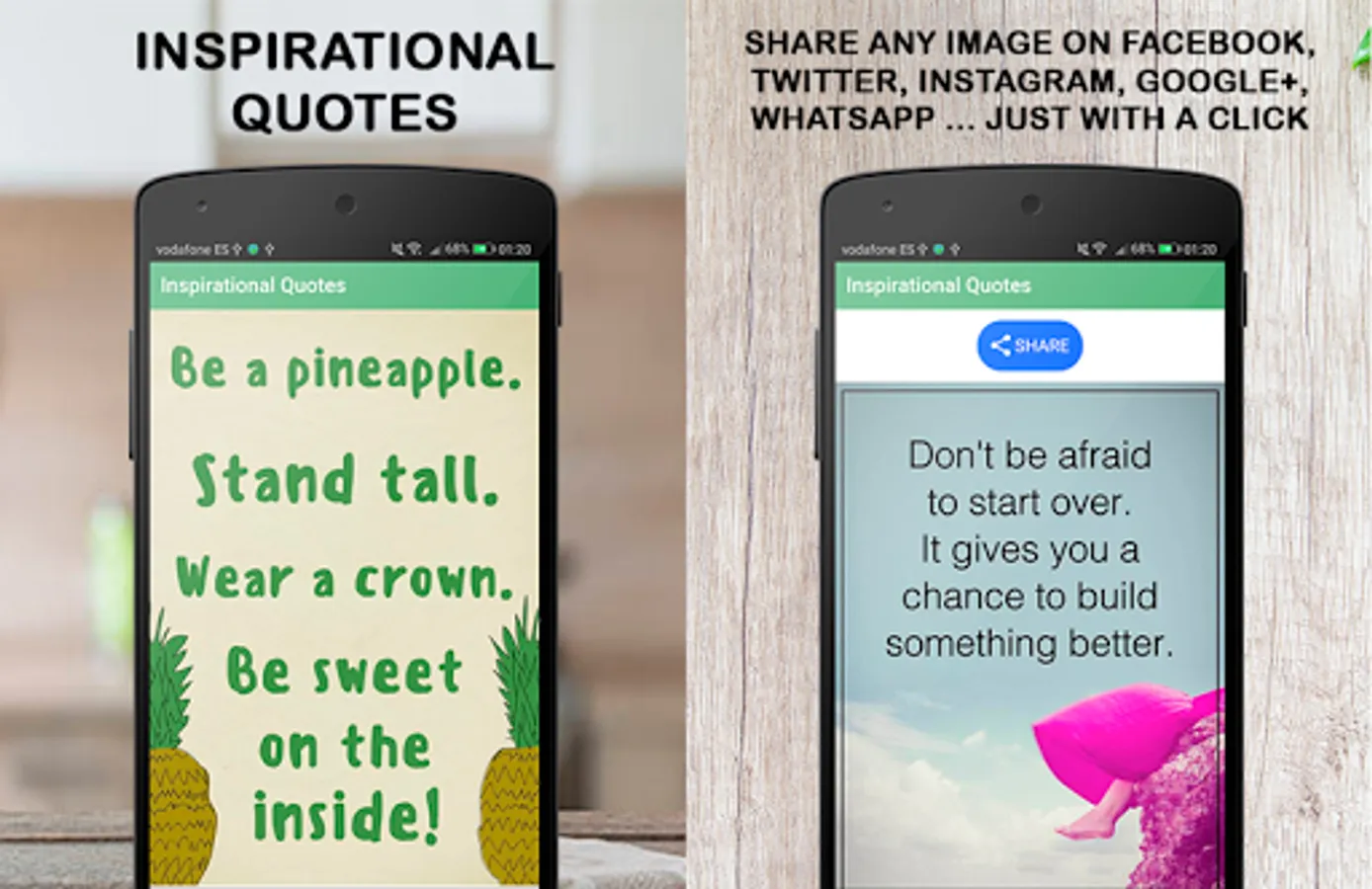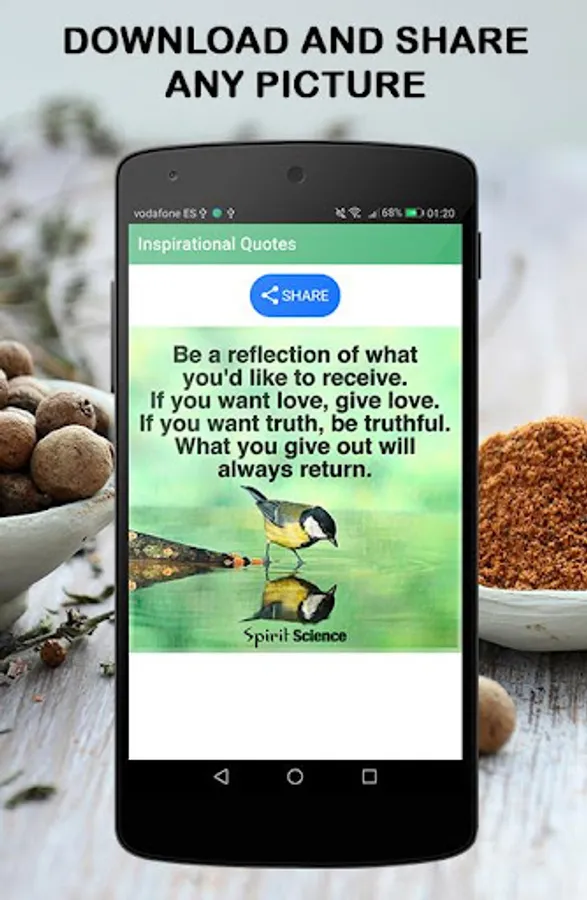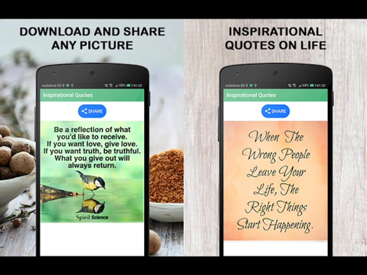 Inspirational quotes is an Android application containing hundreds of wisdom sayings and proverbs that will make you think and reflect. Inspirational quotes written on beautiful images that you can download and share with your family and friends with a single click. Share wisdom sayings and proverbs on your social media profiles etc.