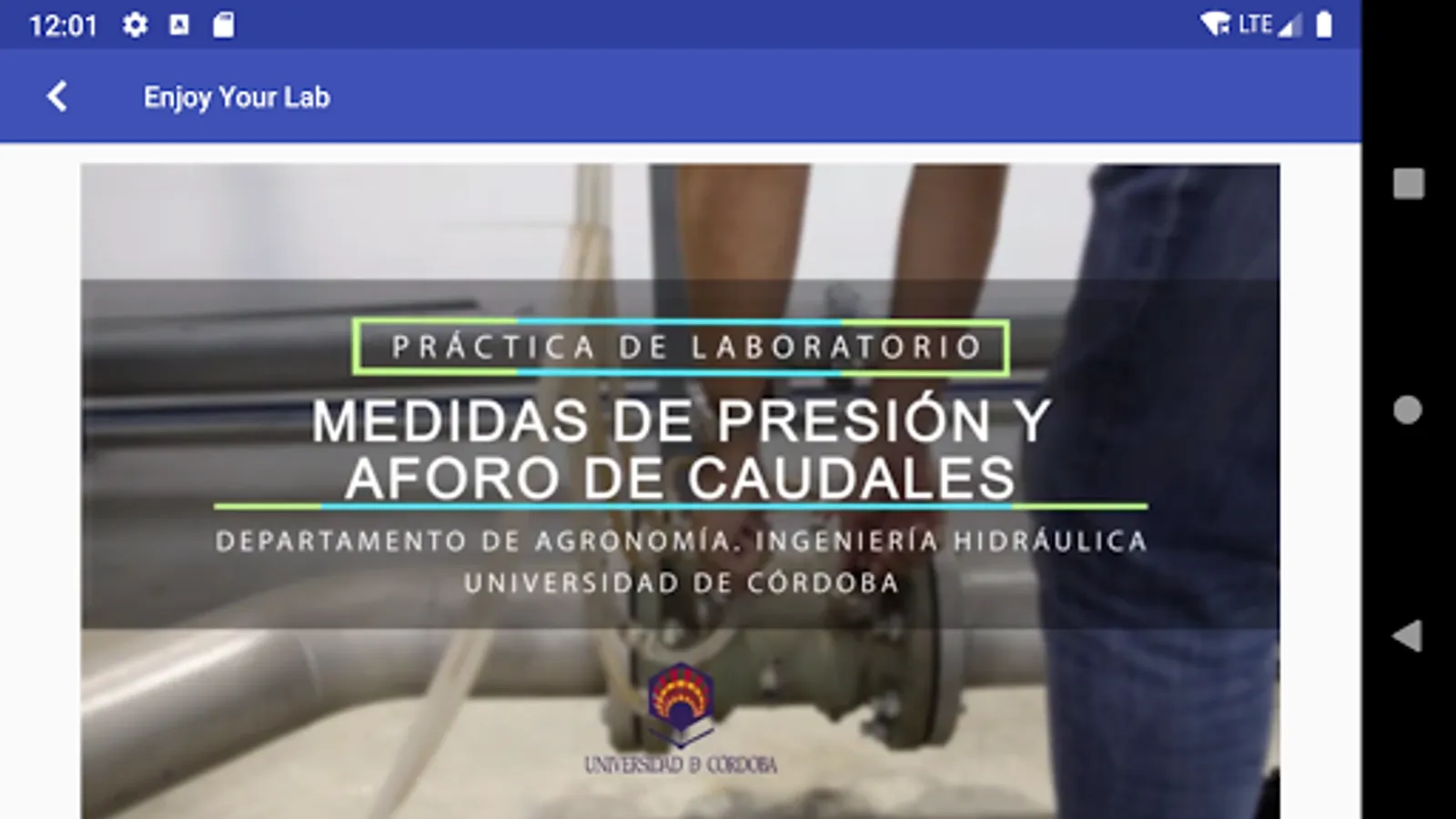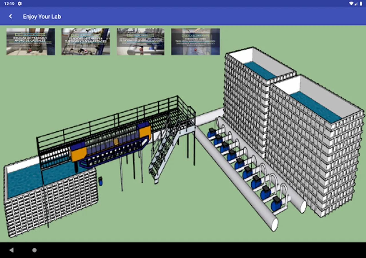 EnjoyYourLAB is a mobile application (APP) to support the teaching of Hydraulic Engineering laboratory practices. The application integrates a virtual recreation of the laboratories as well as the main equipment that constitutes it. Through the App, students will have access to the moodle platform, to the practical reports, audiovisual material and technical information.