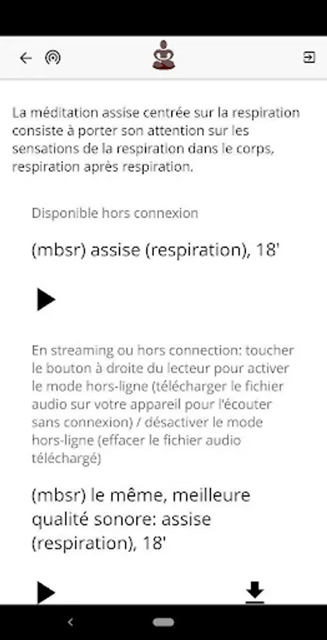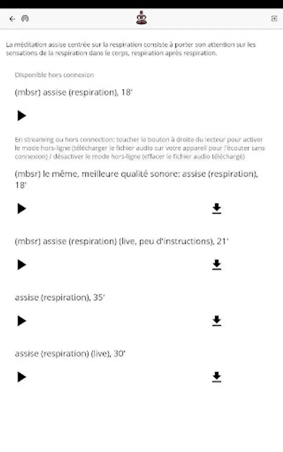 This application allows listening to guided mindfulness meditations. It is primarily intended for participants in mindfulness courses of 6-10 weeks (type MBSR, MBCT, MBRP, MB-EAT, MECL, etc.) who benefit from the supervision of a trainer. qualified, but it is available to everyone.