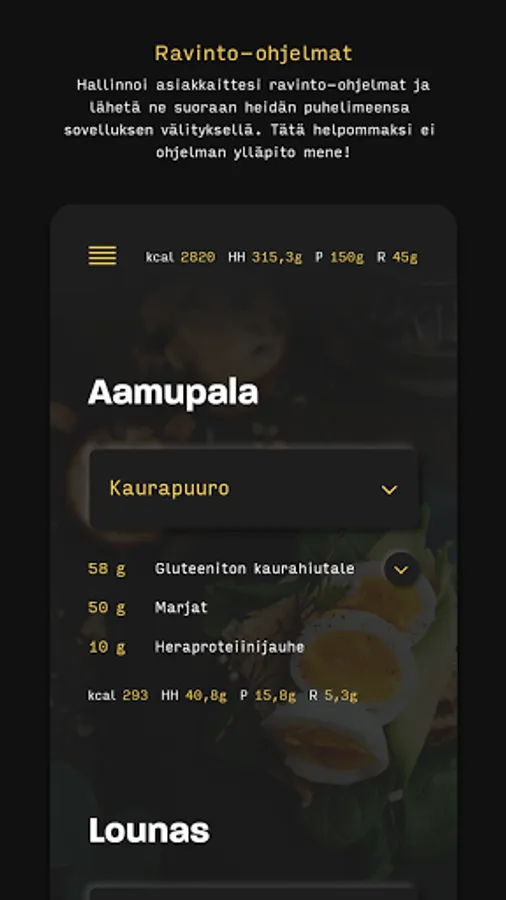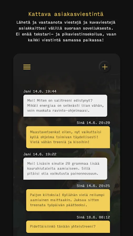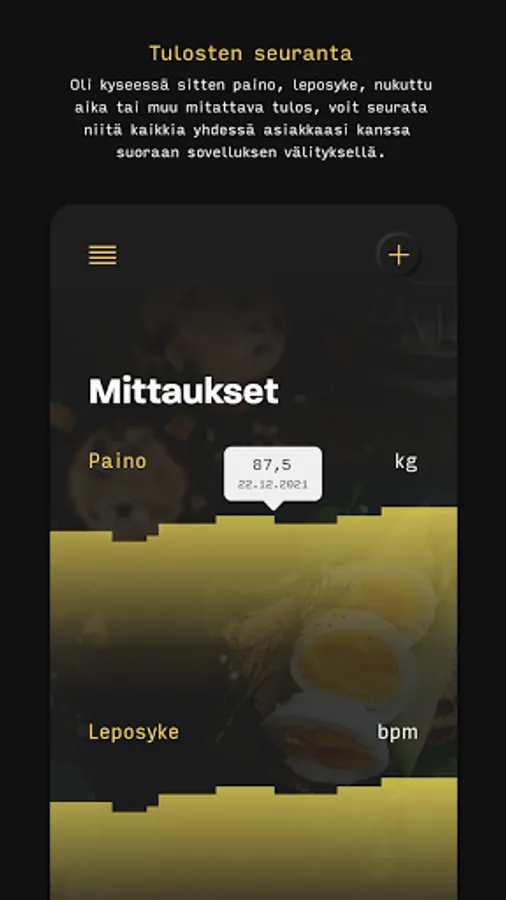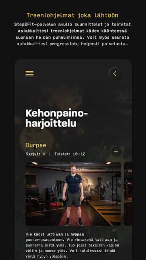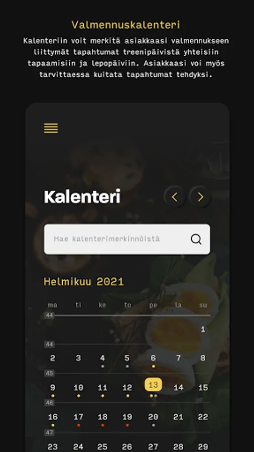 The Step2Fit coaching service is a service designed for wellness professionals that enhances the operations of a wellness coaching company and improves the service, as well as provides an efficient, modern way of communicating with customers. Through the service, the coach can maintain his clients' nutrition programs, measurement and training result monitoring, training programs, calendar, diary and customer communications holistically.