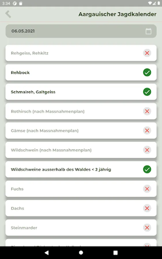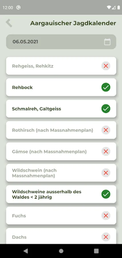 Display of hunting and closed seasons on the current date with the option of choosing a different due date.