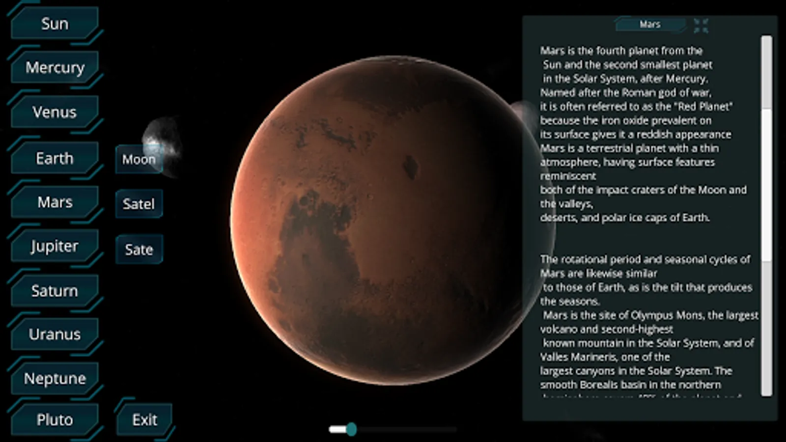 In Solar System Planets encyclopedia you will find the most interesting facts about the Planets, dwarf Planets, every major moon, satellite of Mars, Jupiter, more information about Aphelion, Perihelion, Semi-major axis, Eccentricity... explore outer space in realistic 3D simulation and interact with them. Solar System Planets 3D app simply provide brief knowledge about our Solar System in particular and universe in general Solar System models and complete information about our Solar System in 3D view visualization. Explore Solar System Planets and 3D space, it’s a free tour of Solar System model which can help you to gain all info about our Solar System in easy way. You can explore the celestial objects and galaxy gravitation-ally bound system of stars dark matter and much more about our Solar System