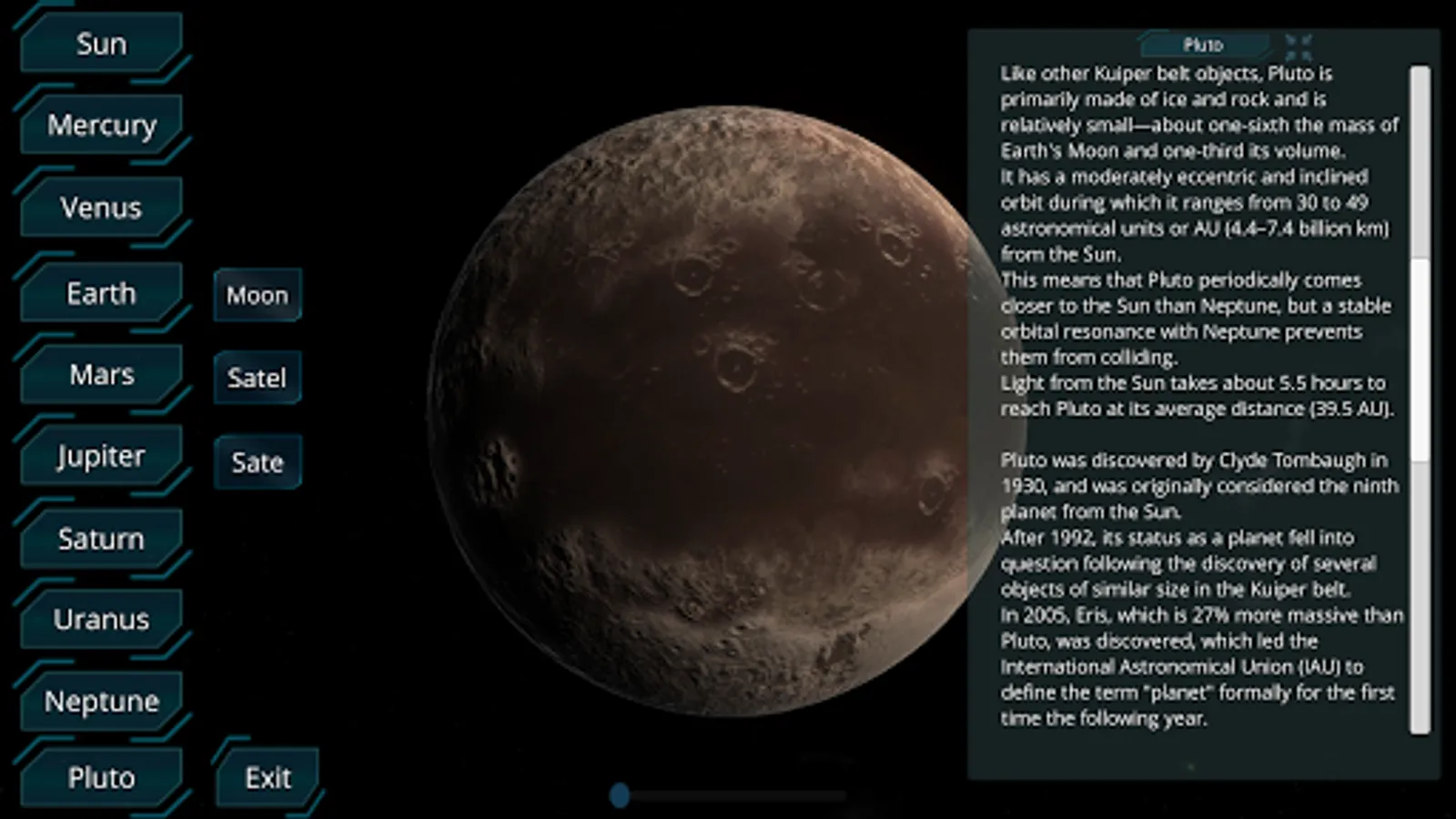 • Real time rotation, satellites in space, dwarf planets, asteroids. Explore general information about any celestial body, planet positions, stars names, find interesting astronomy facts.