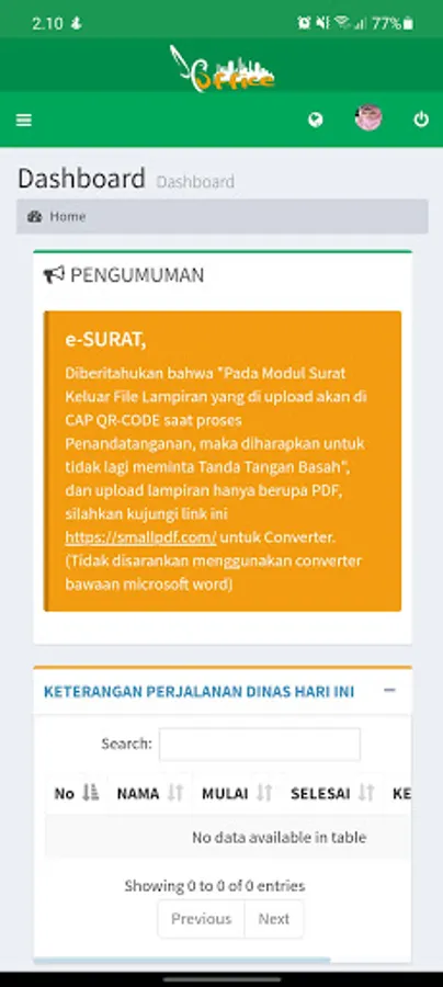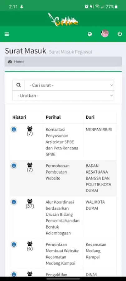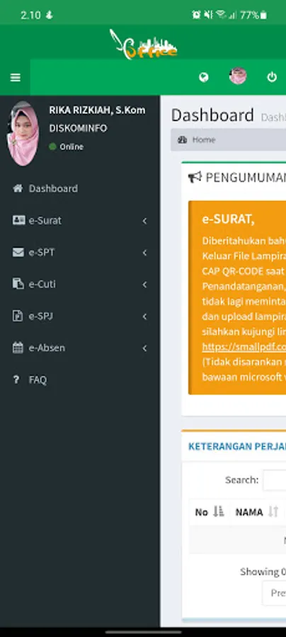 Dumai City Government office application electronically with the support of Electronic Signature (TTE) and various office affairs features such as e-Surat, e-Leave, e-SPT, e-Absen and e-SPJ
