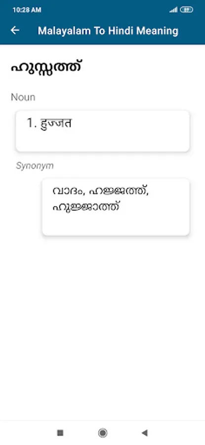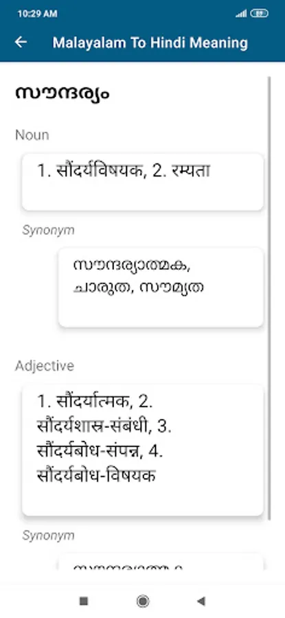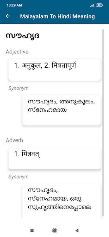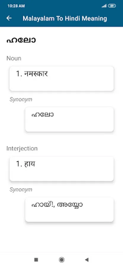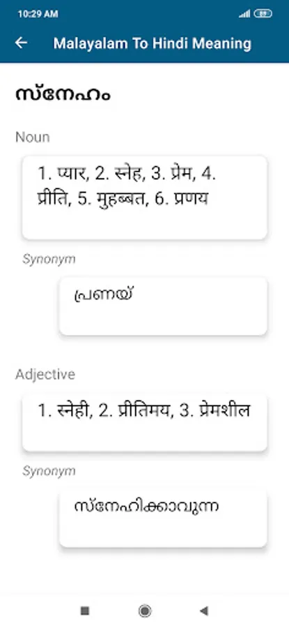 Malayalam To Hindi Dictionary is an android app for Malayalam to Hindi language. Users can also choose the Malayalam words for their meaning in Hindi.